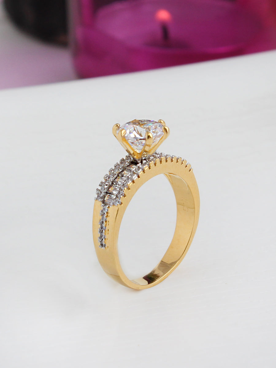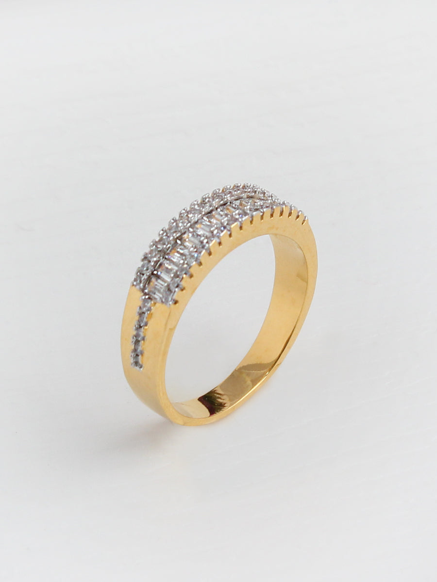 Silver / gold tone finger ring studded with simulated diamond CZs and baguette cut stones.