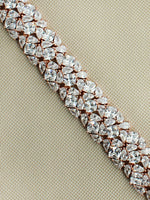 Introducing a dazzling Rose Gold / Silver Tone Bracelet, adorned with simulated diamond CZs for a touch of sophistication and glamour. The intricate design and sparkling stones make it a perfect accessory for special events and celebrations.