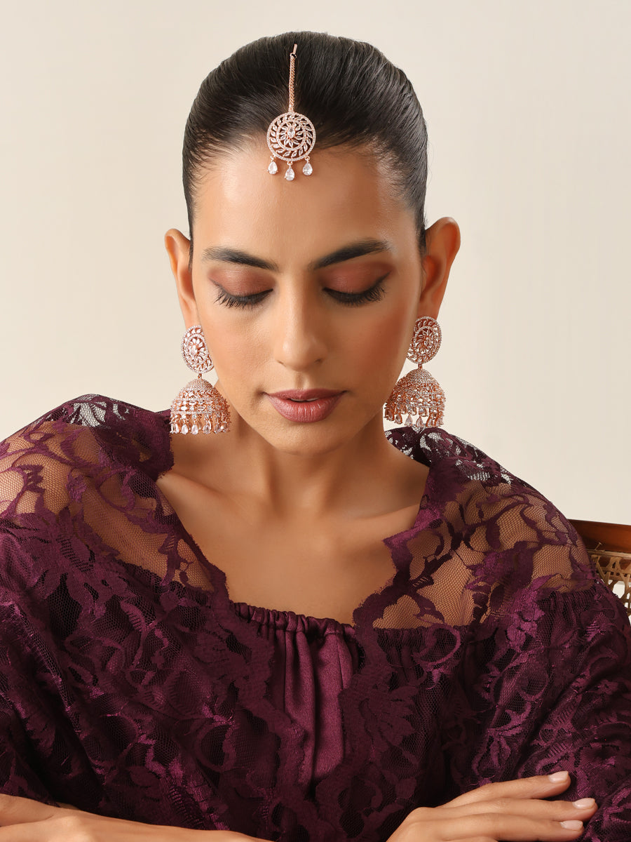 This set combines the elegance of jhumka earrings and a matching tikka, adorned with simulated polkis and CZs, creating a coordinated and stylish look.