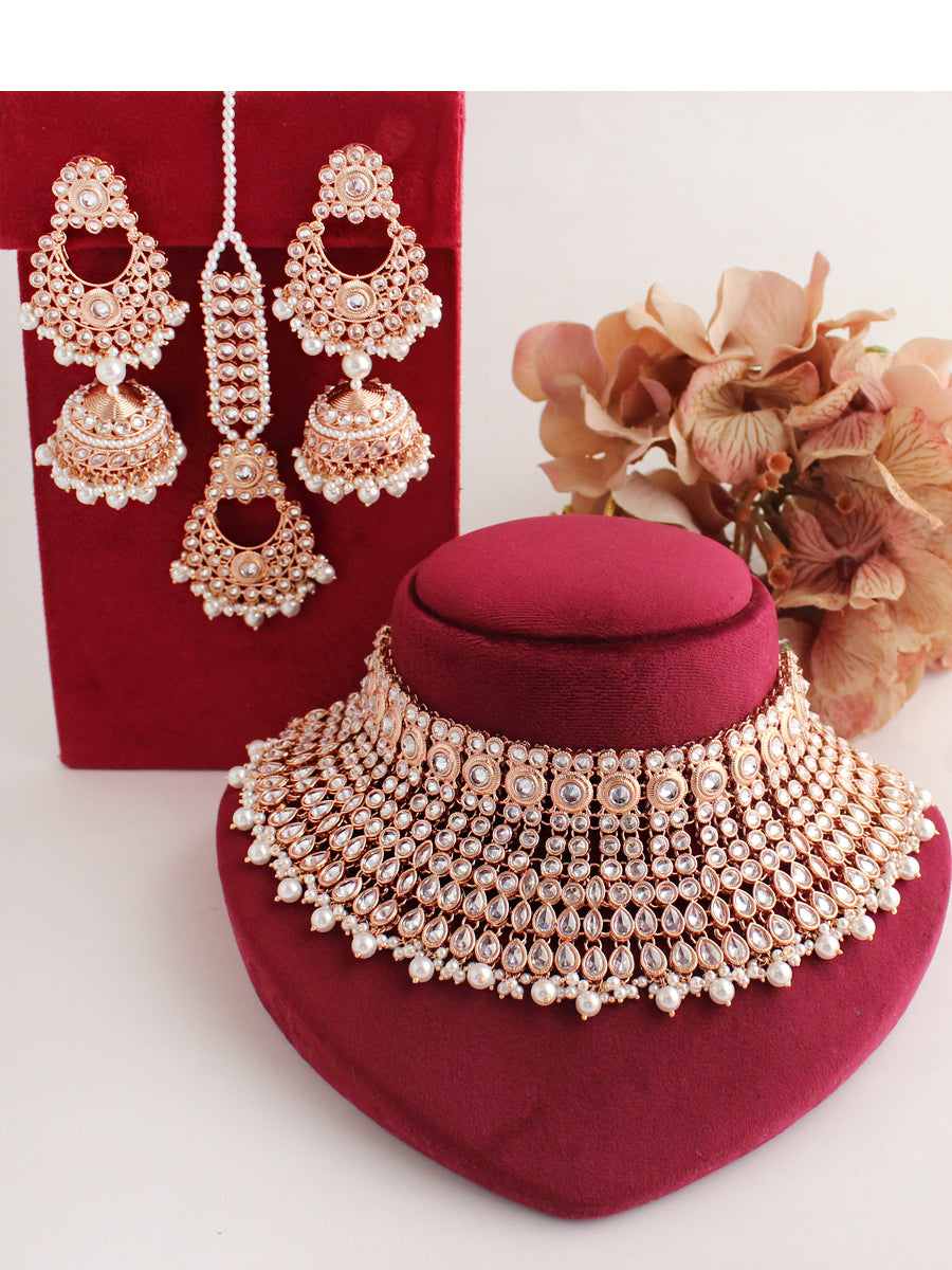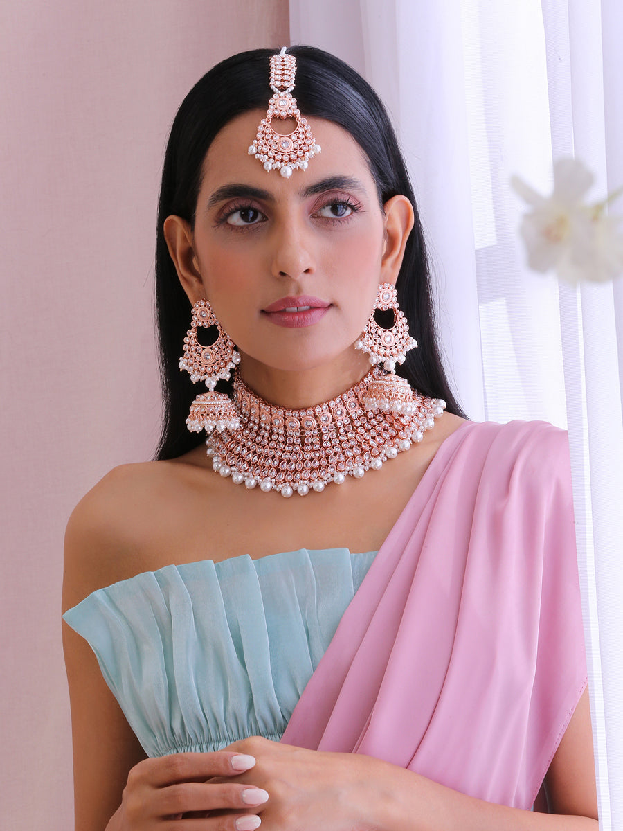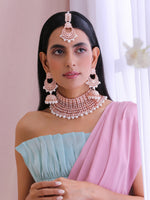 Rose Gold Finish Bib Necklace Set Studded with Simulated Polki Pastel Pink Stones & Beads.