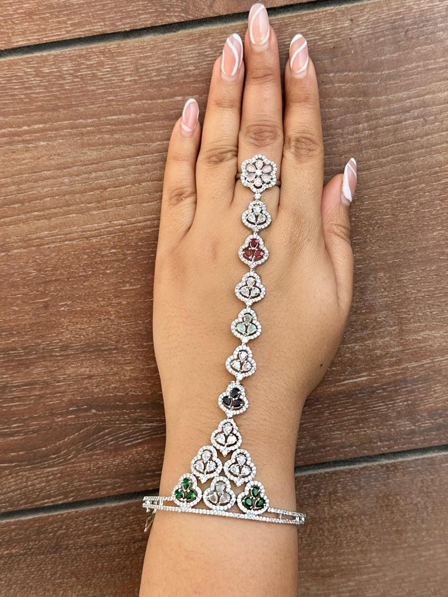 This hand harness/bracelet is designed to add a touch of elegance to your ensemble. The combination of simulated diamond CZs, polkis, and multi-color stones provides a dazzling and vibrant look. The adjustable size ensures a comfortable fit for wrists up to 2.8. The high-grade alloy metal construction promises durability and a stylish finish.