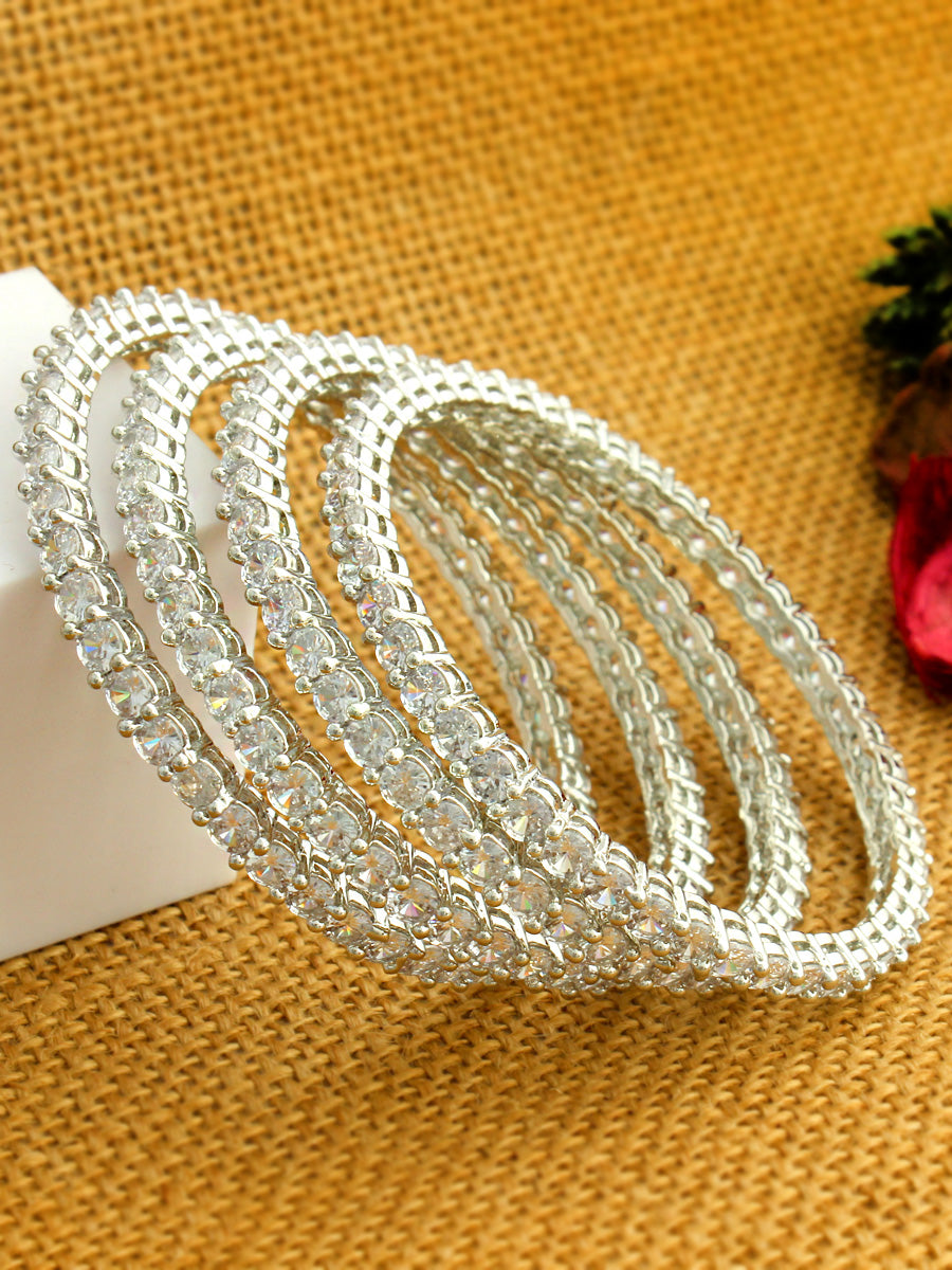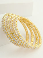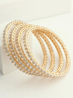 This set of 4 bangles features a stunning combination of silver, golden, and rose gold tones, adorned with simulated diamond CZs for a touch of sparkle. Crafted from high-grade alloy metal, these bangles offer a versatile and stylish addition to your jewelry collection. Elevate your look with the shimmering elegance of these beautifully embellished bangles.