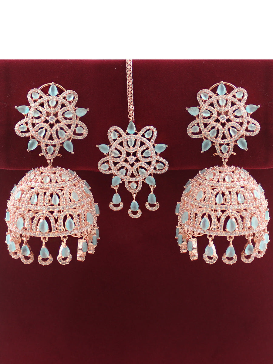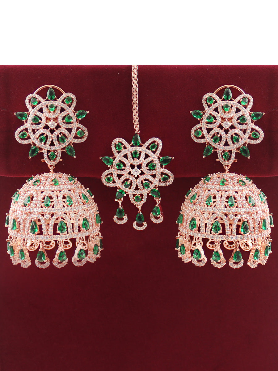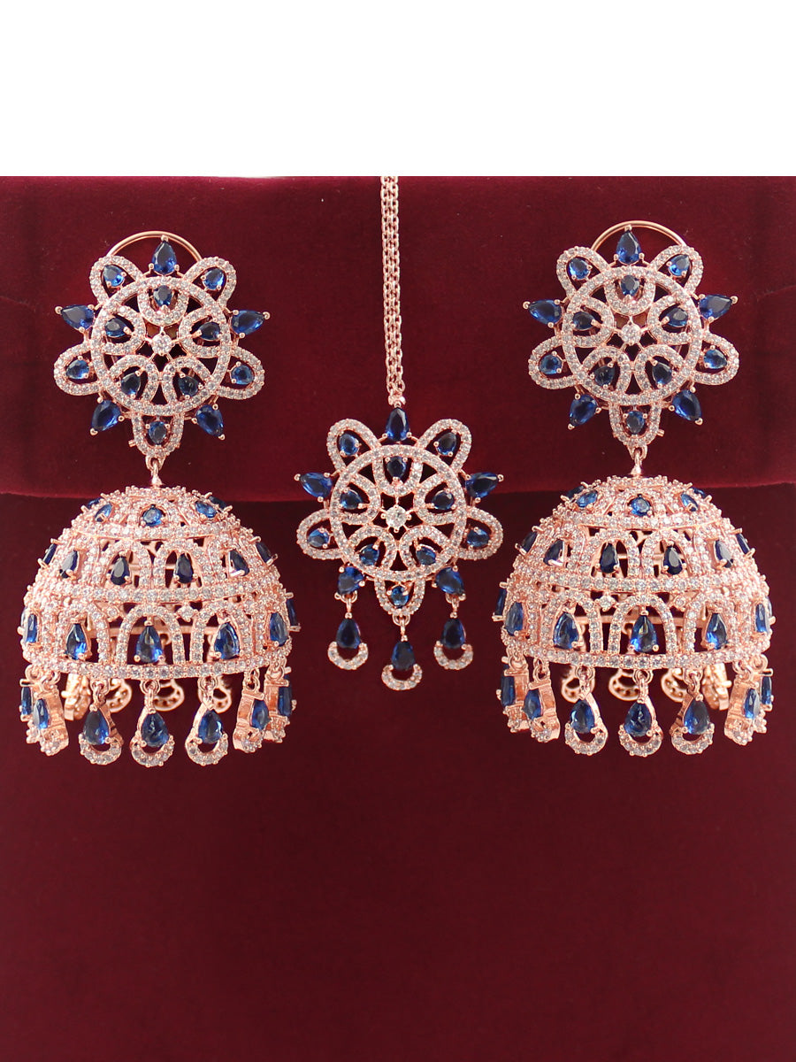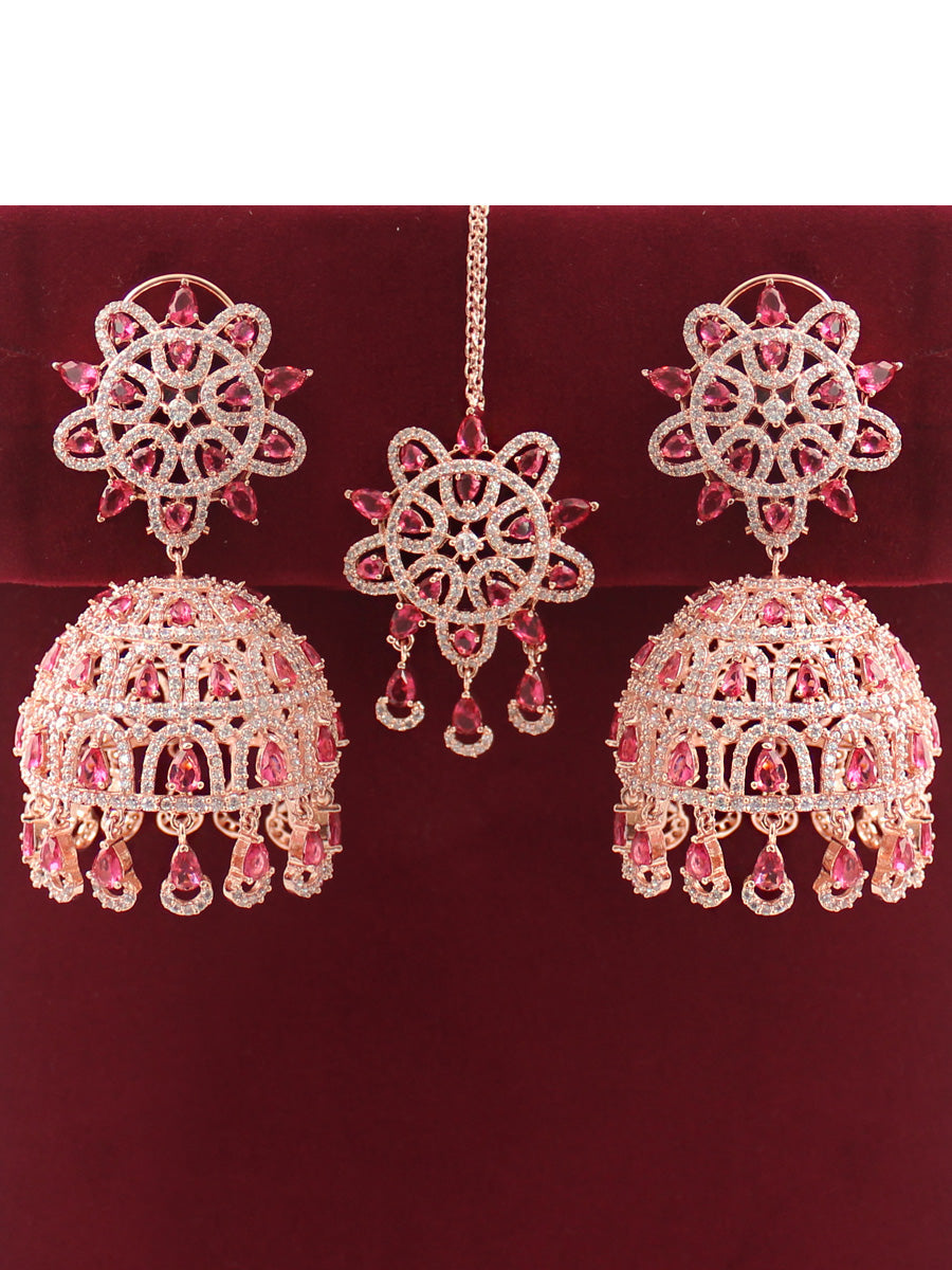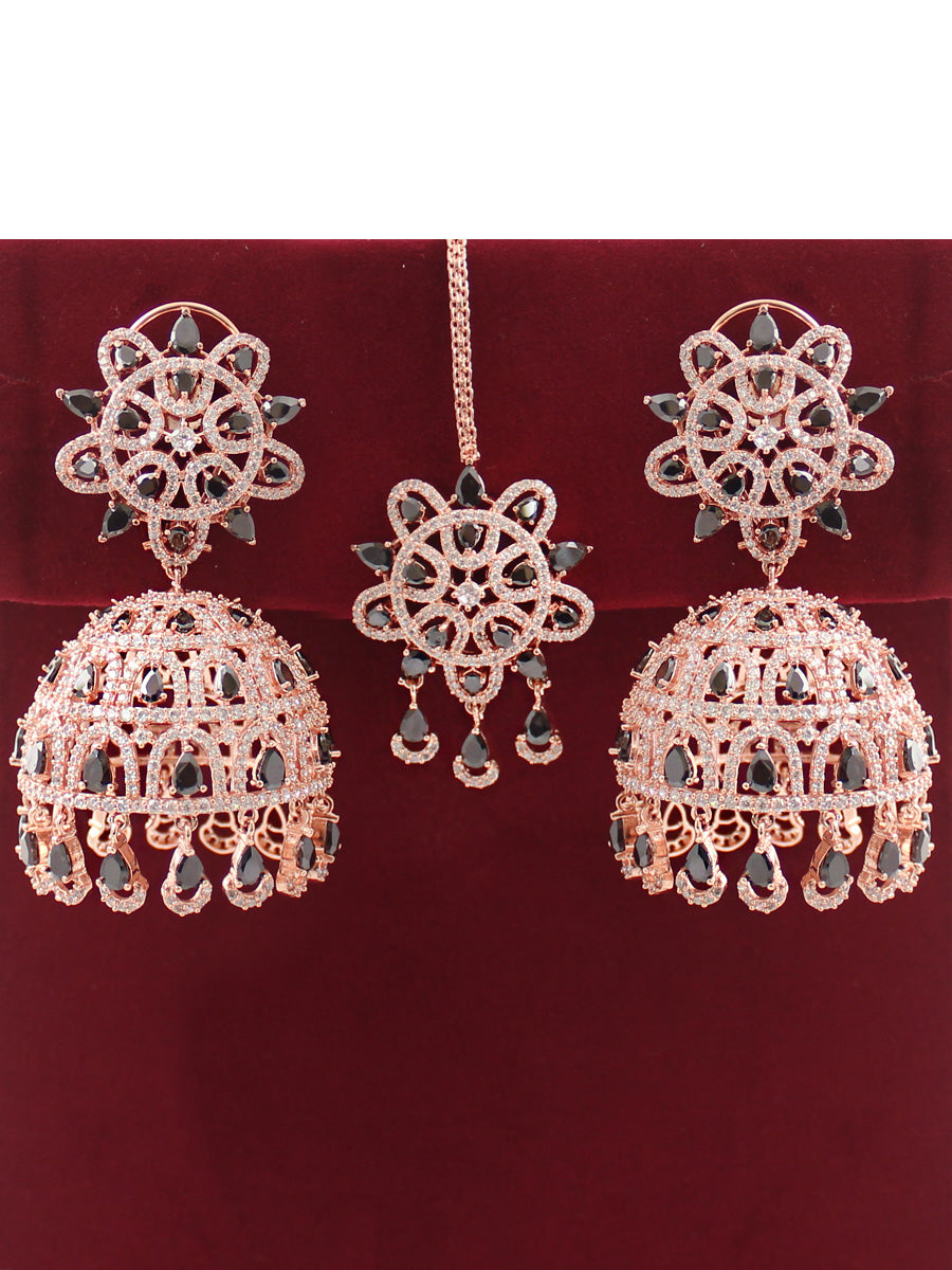 The Rose Gold & Silver Tone Jhumki Earrings and Tikka you described are adorned with simulated diamond CZs and color stones, creating an elegant and intricate design. Here are the specifications: