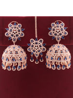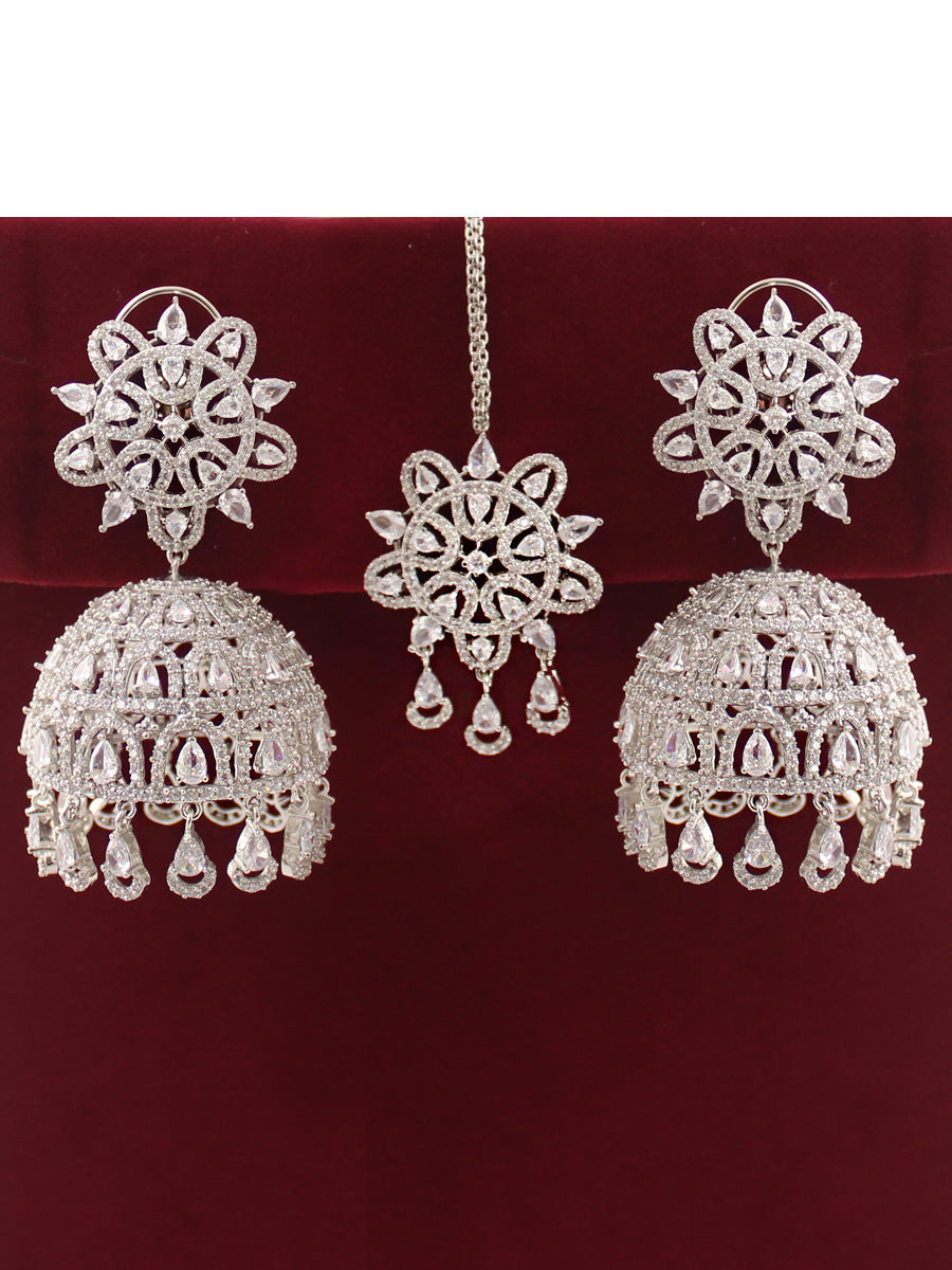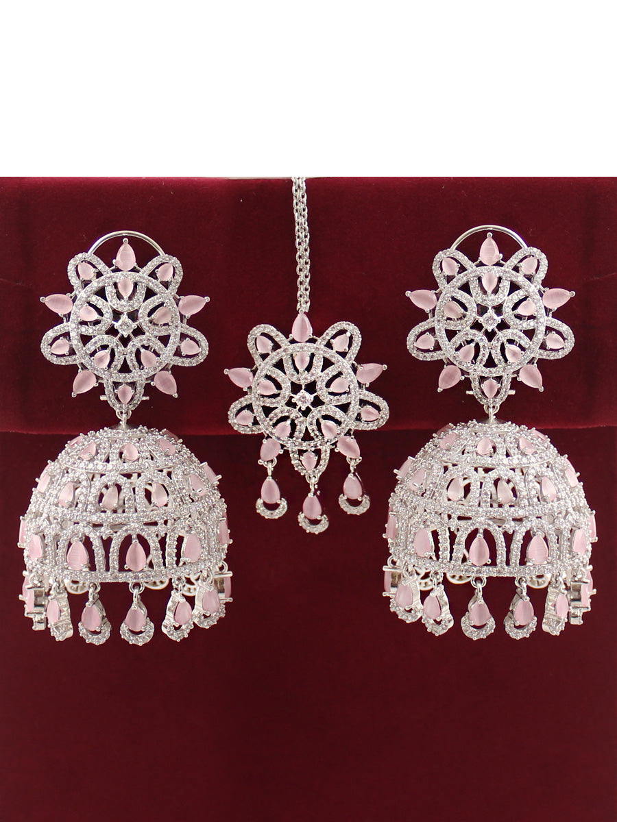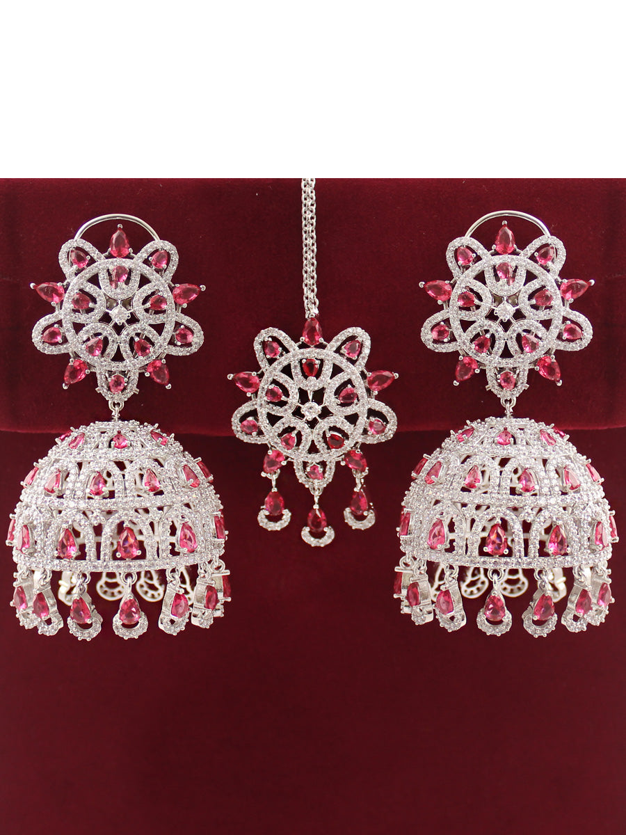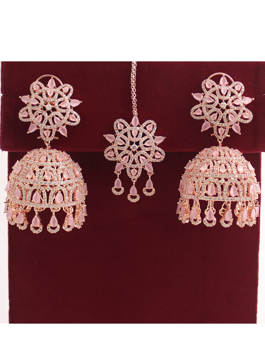 The Rose Gold & Silver Tone Jhumki Earrings and Tikka you described are adorned with simulated diamond CZs and color stones, creating an elegant and intricate design. Here are the specifications:
