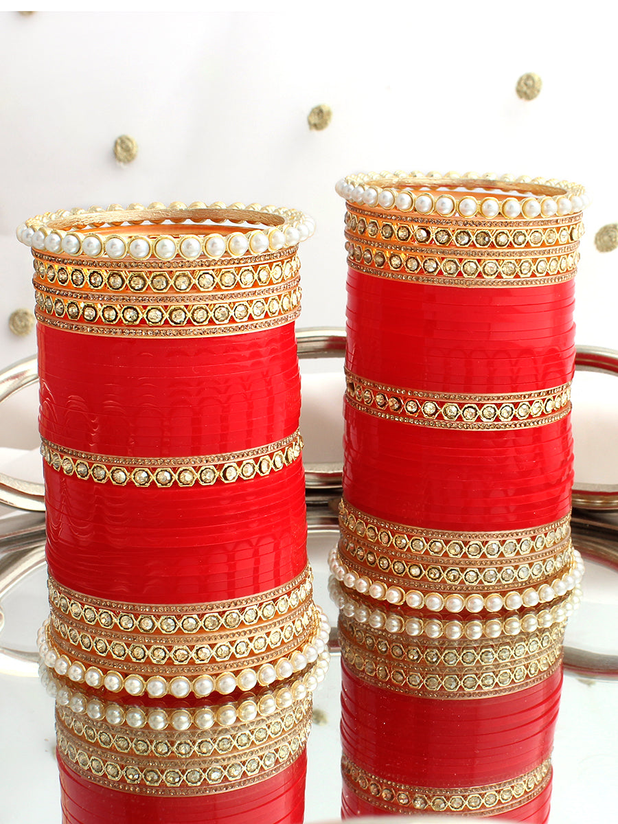 A set of 78 pieces Bridal Chuda /Choora/ Chooda bangles with CZs, simulated polkis, and faux pearls.
