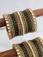 Introducing our stunning 38 Piece (2 Set) Green Bangle Set, adorned with faux pearls, simulated Kundans, Czs, for a touch of sophistication and glamour.crafted from high-grade alloy metal. The intricate design and sparkling kundans make it a perfect accessory for special events and celebrations. This set includes both hands' worth of bangles and features intricate detailing.