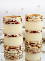A set of 78 Pieces bridal chuda/choora/chooda bangles studded with CZs, simulated kundas and beautifully decorated with golden Inlay work creating an elegant and traditional look. The details of the bangle set are as follows: