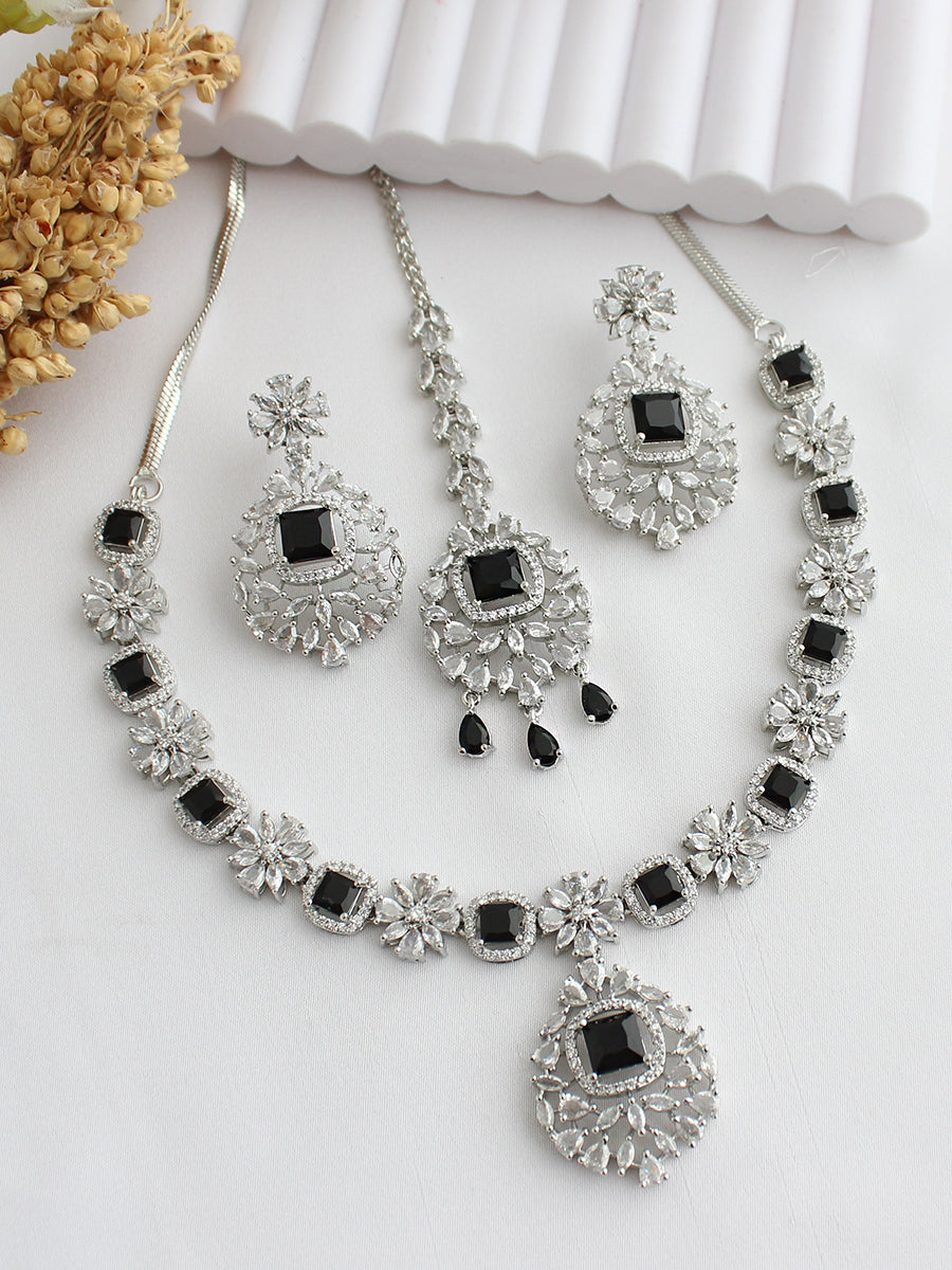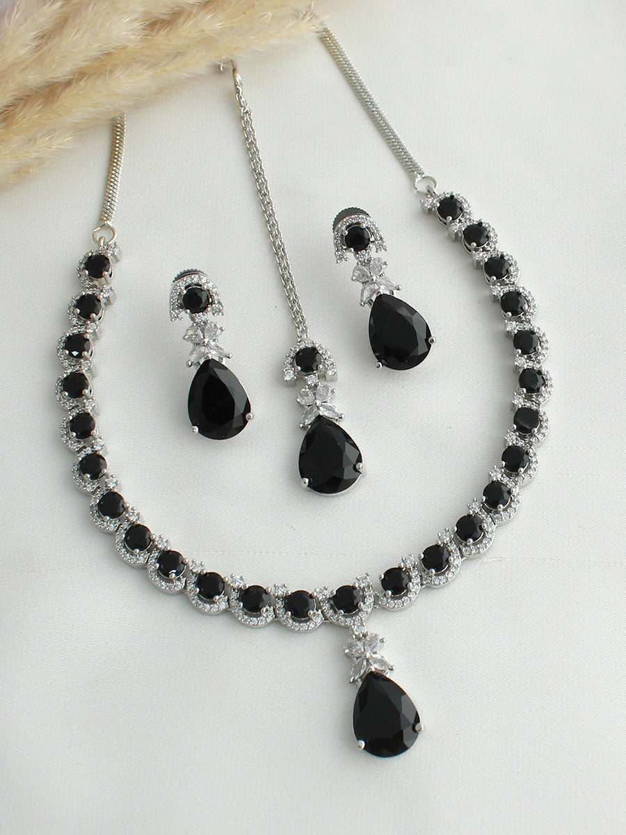 Discover the 'Noah' necklace set, a delicate ensemble featuring a stunning necklace adorned with sparkling cubic zirconia stones, culminating in a dazzling drop at its heart. This elegant set is complemented by matching drop earrings and a tikka, creating a look of understated sophistication. The 'Noah' necklace set is a must-have for any jewelry enthusiast, available in both silver and antique gold finishes, with a variety of colors to choose from.
