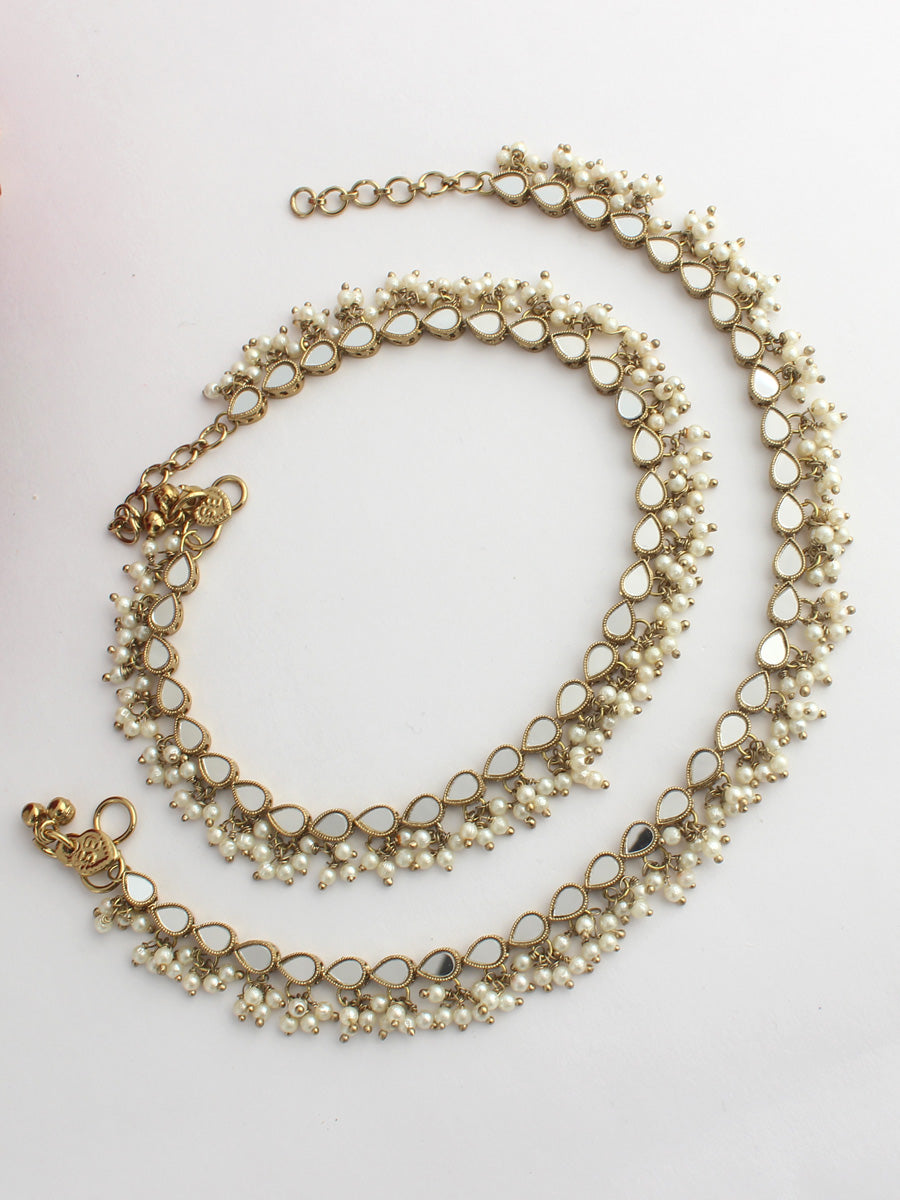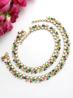 1 Pair Gold / Silver Anklet Payal Studded with Mirrors and Multi Color Beads. These anklets are designed with intricate detailing, featuring mirrors and multi-color beads for a vibrant and eye-catching look. The full size of the anklets is 320mm or 12 3/4". Crafted on a base of high-grade alloy metal, these anklets offer a stylish accessory to enhance your overall look.