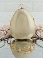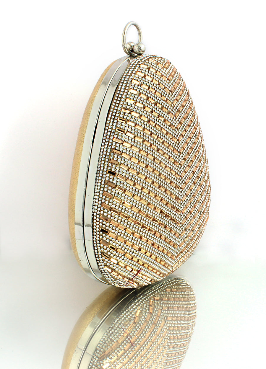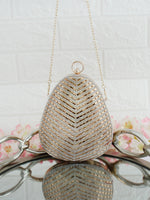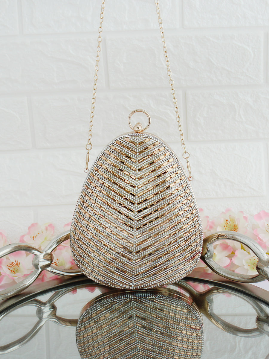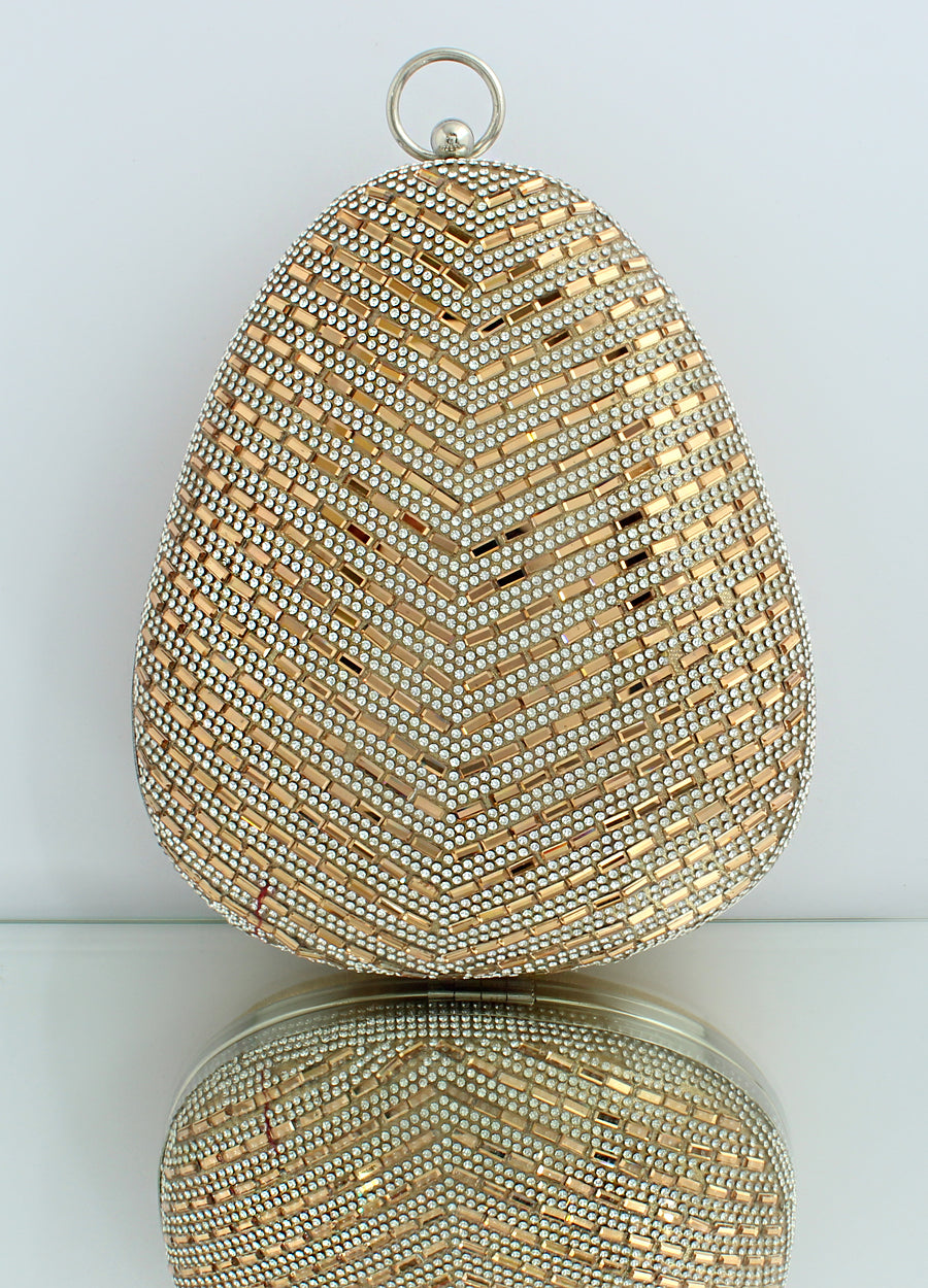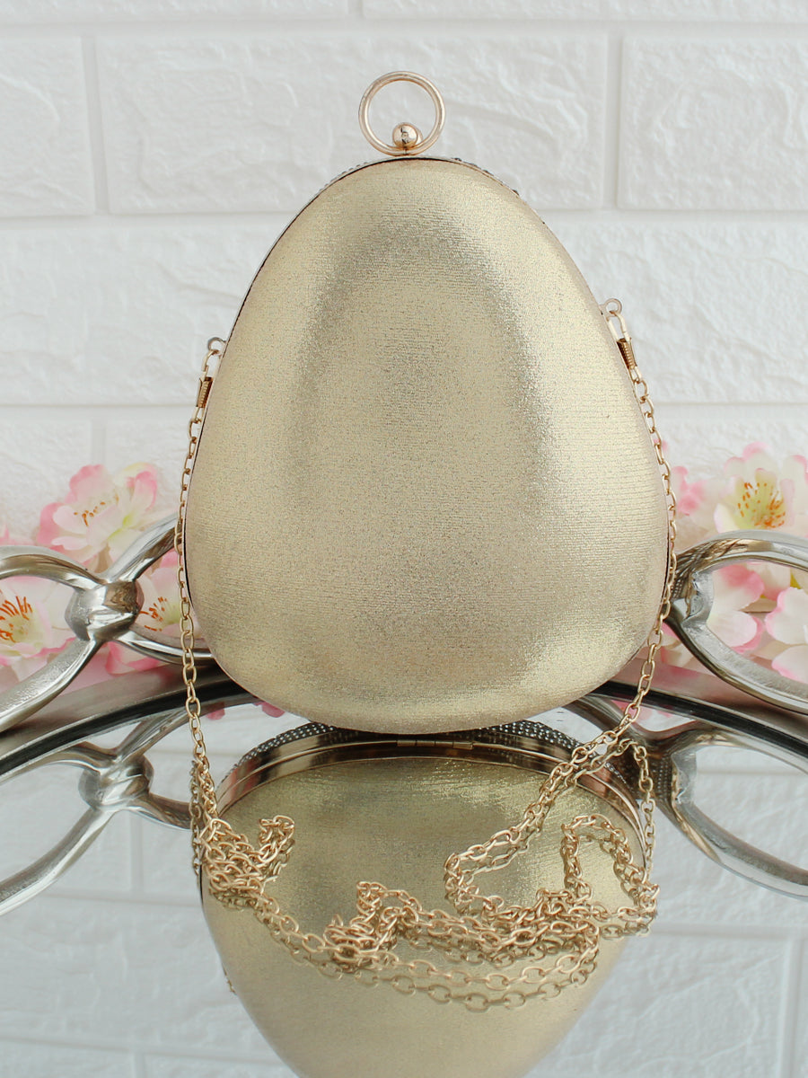 This golden Pear-shaped clutch bag box adorned with CZs and stones at the front and golden fabric at the back. It has a metal frame with a metallic clasp lock. It features a handle & golden chain shoulder strap. This bag can fit a smartphone, makeup, keys, currency and cards.
