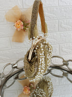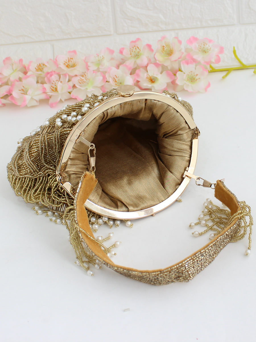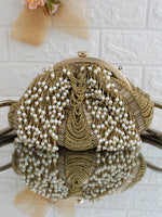 This clutch bag / batua soft pouch adorned with crystal beads and pearl drops, It has a metal frame with a metallic clasp lock. It features an detachable strap. This bag can fit a smartphone, makeup, keys, currency and cards.