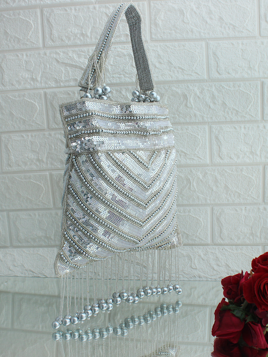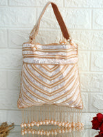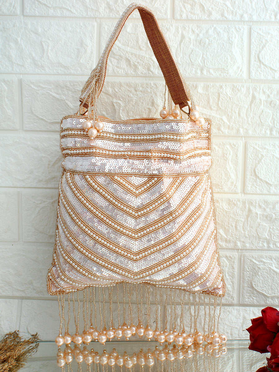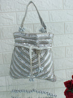 Presenting our exquisite Potli Bag, beautifully adorned with sequins, pearls, and beads to add a touch of elegance and sophistication. Designed with meticulous attention to detail, this potli features a convenient drawstring closure, allowing you to secure your essentials with ease, while the tassels at the end and embellished handle provide a charming and stylish touch. This bag is the perfect blend of practicality and style, offering ample space to carry your essentials like your smartphone, makeup, keys, currency, and cards.