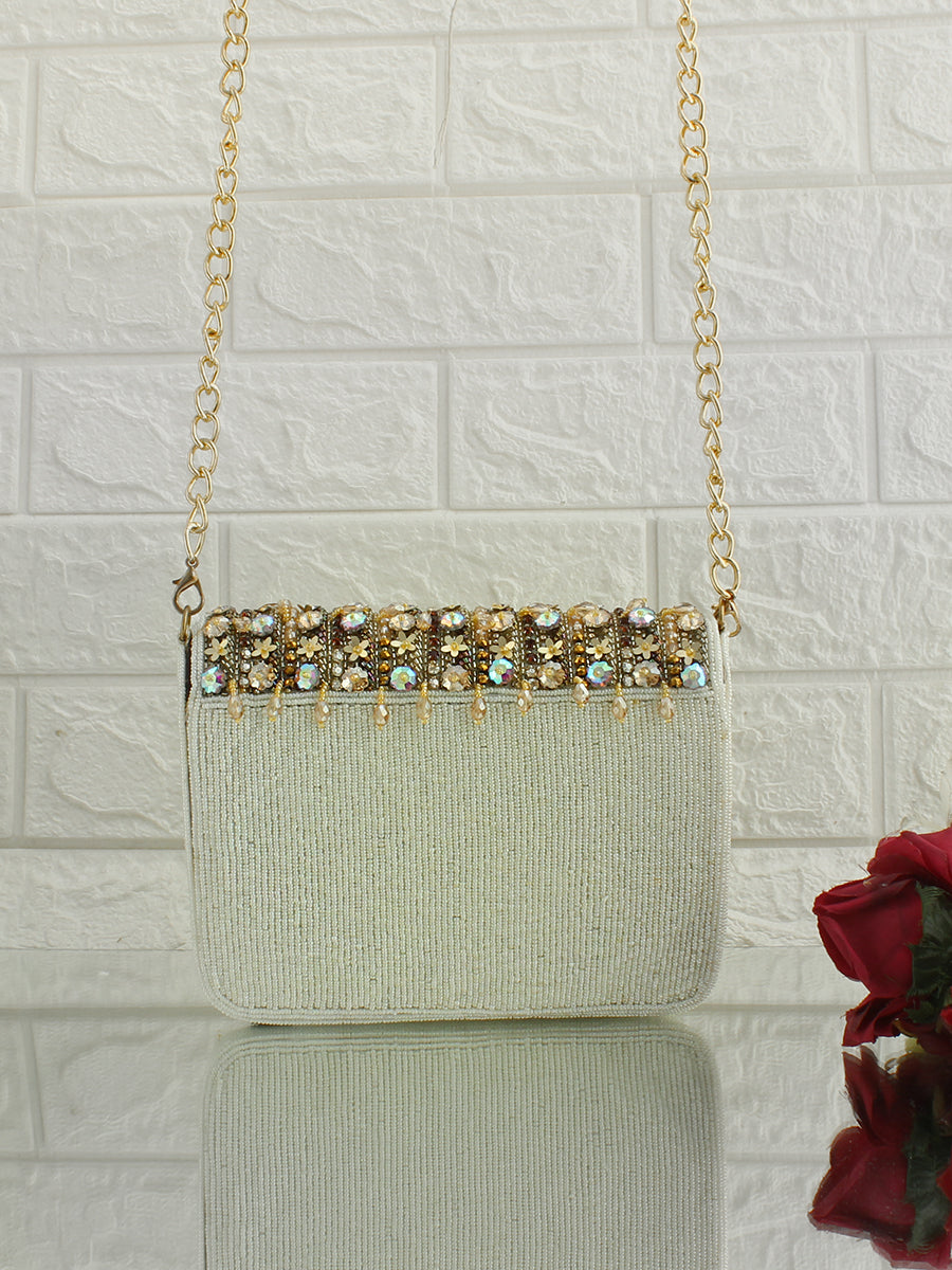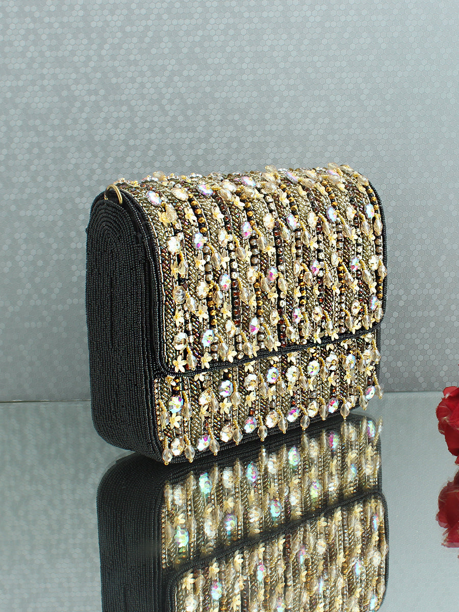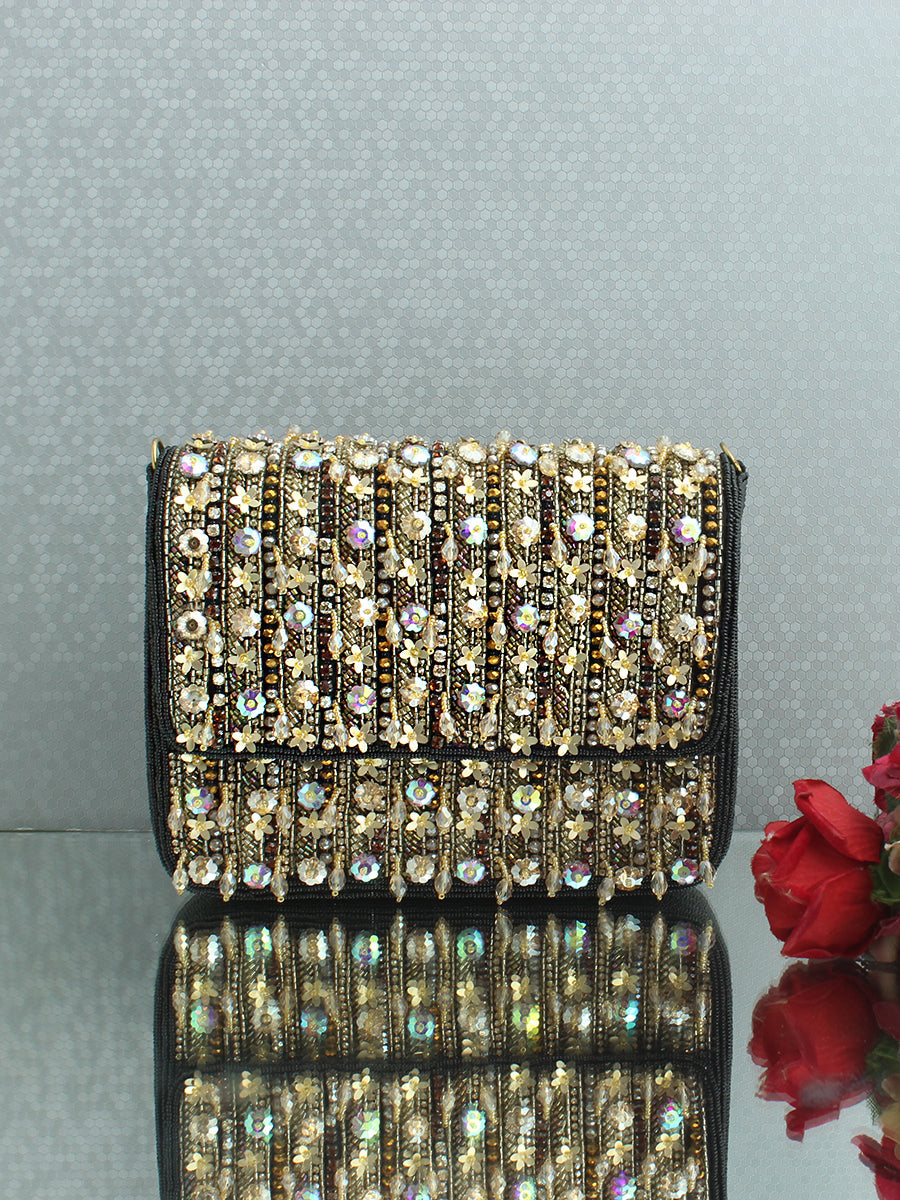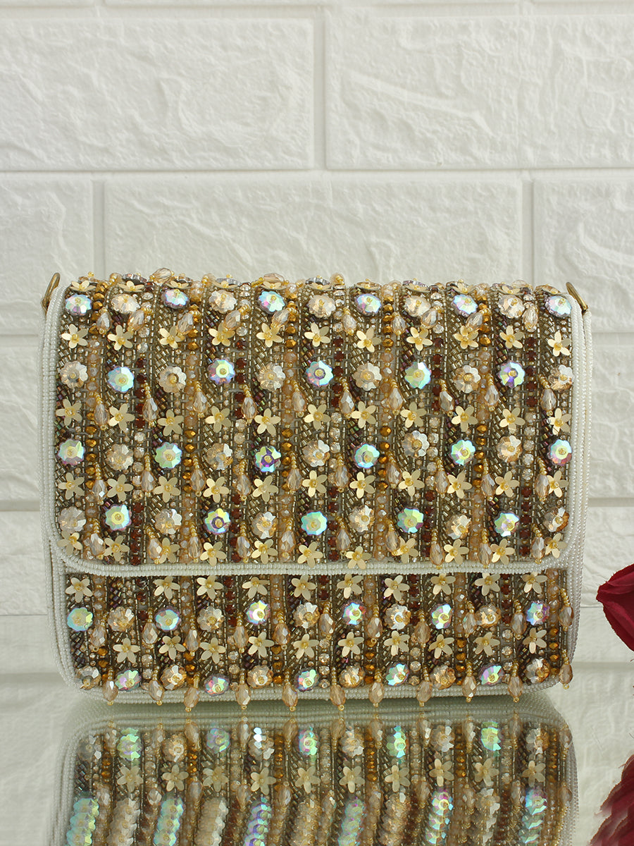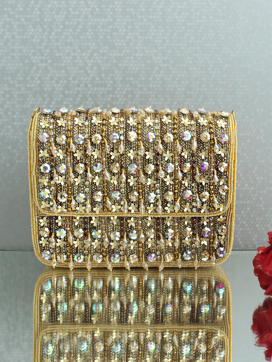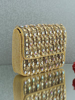This exquisite combination gold and ivory flap-over bag/purse is beautifully adorned with sparkling Czs, sequins, and shiny rainbow crystal beads, creating a radiant and luxurious effect. It features a secure magnetic closure and a detachable crossbody chain handle, offering versatility in how you carry it. Despite its compact size, this bag is designed to fit your essentials, including a smartphone, makeup, keys, currency, and cards. The perfect accessory for any special occasion, this bag combines elegance, practicality, and a touch of glamour.