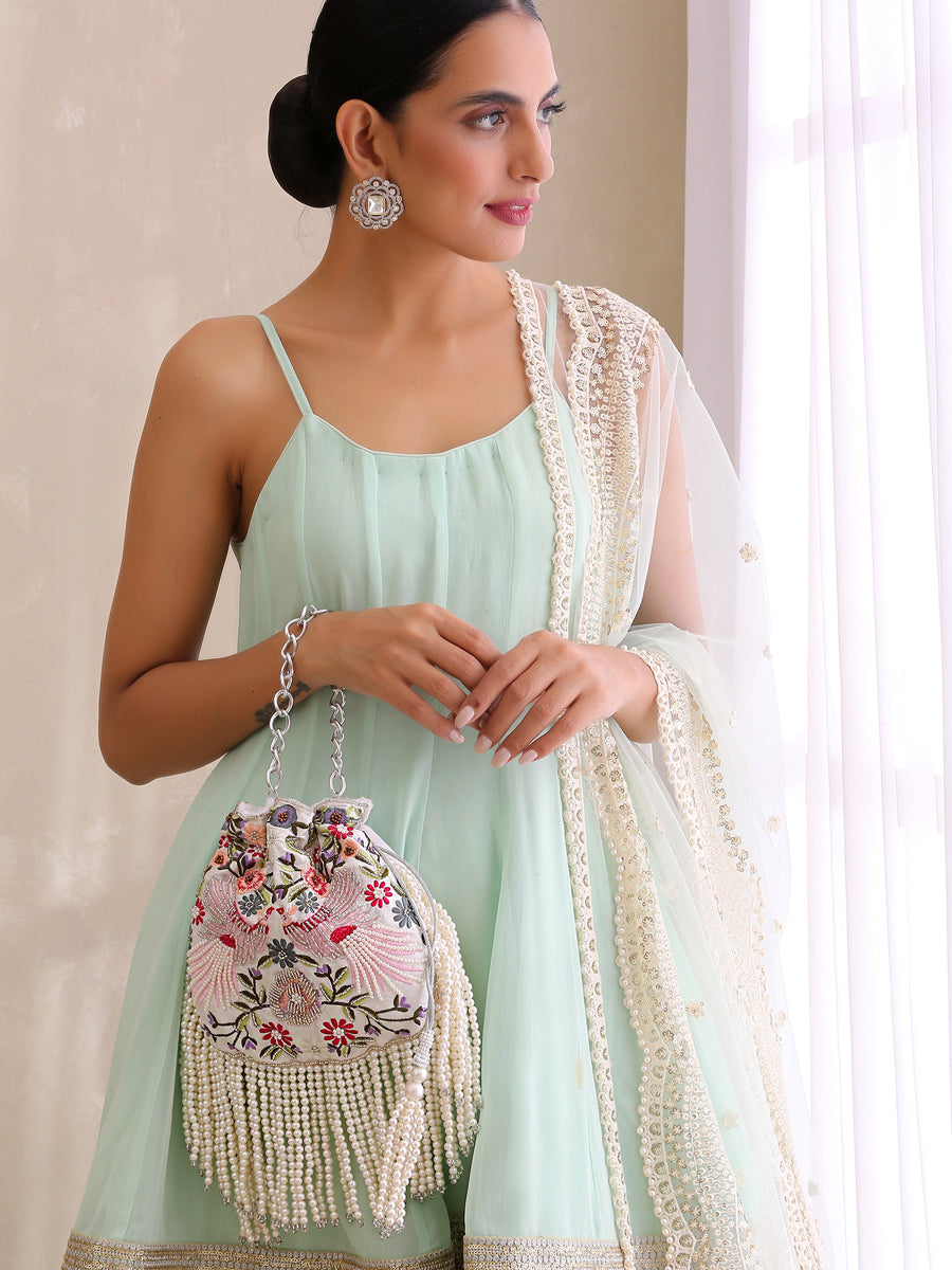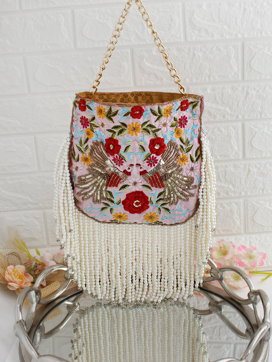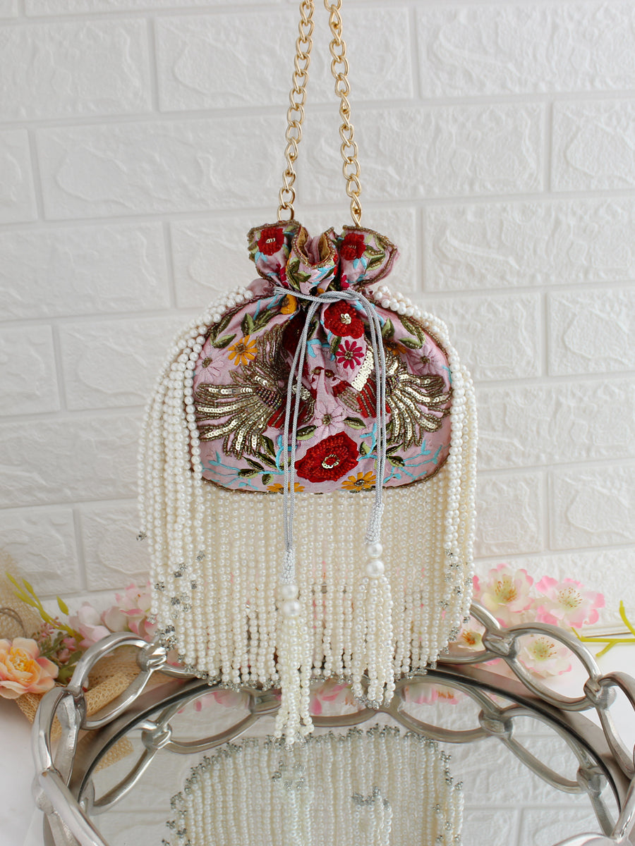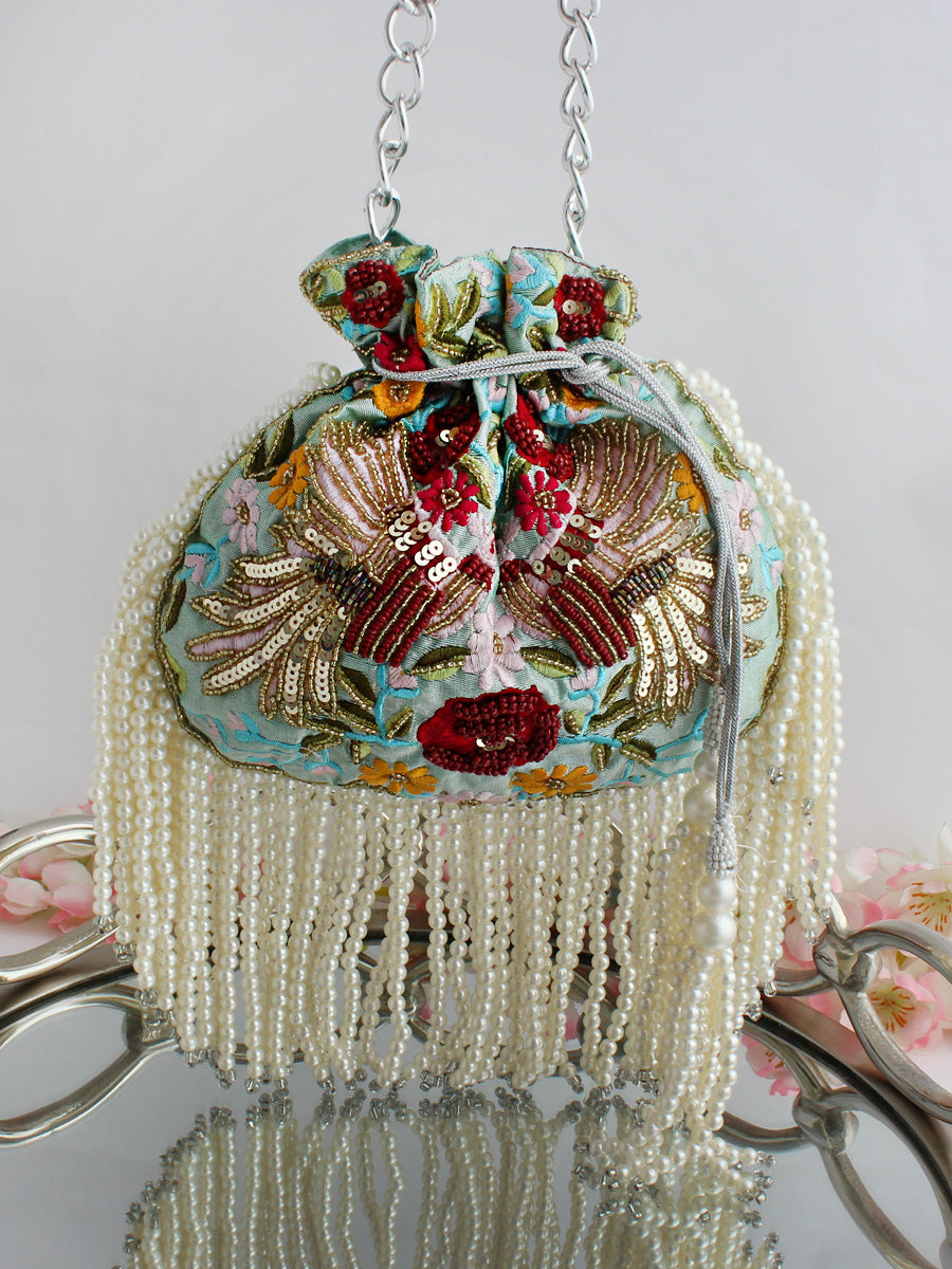 - Crafted from silk fabric material, this potli seamlessly combines style and functionality, making it an ideal accessory for various occasions. The drawstring closure adds a traditional touch, and the hanging pearls string embellishments enhance the overall aesthetic, ensuring you make a statement wherever you go.