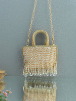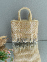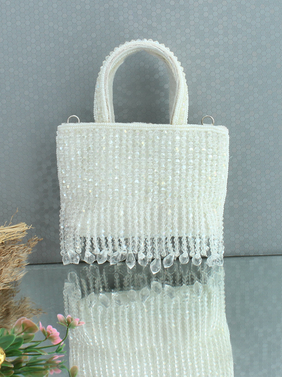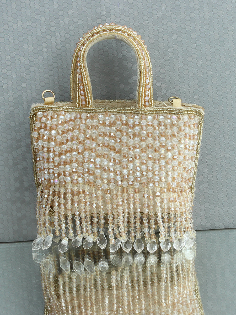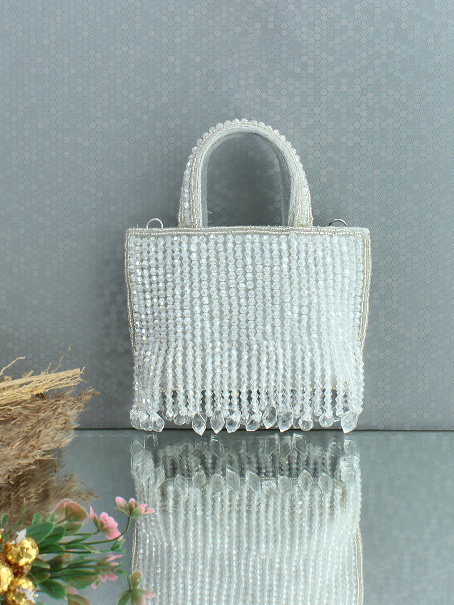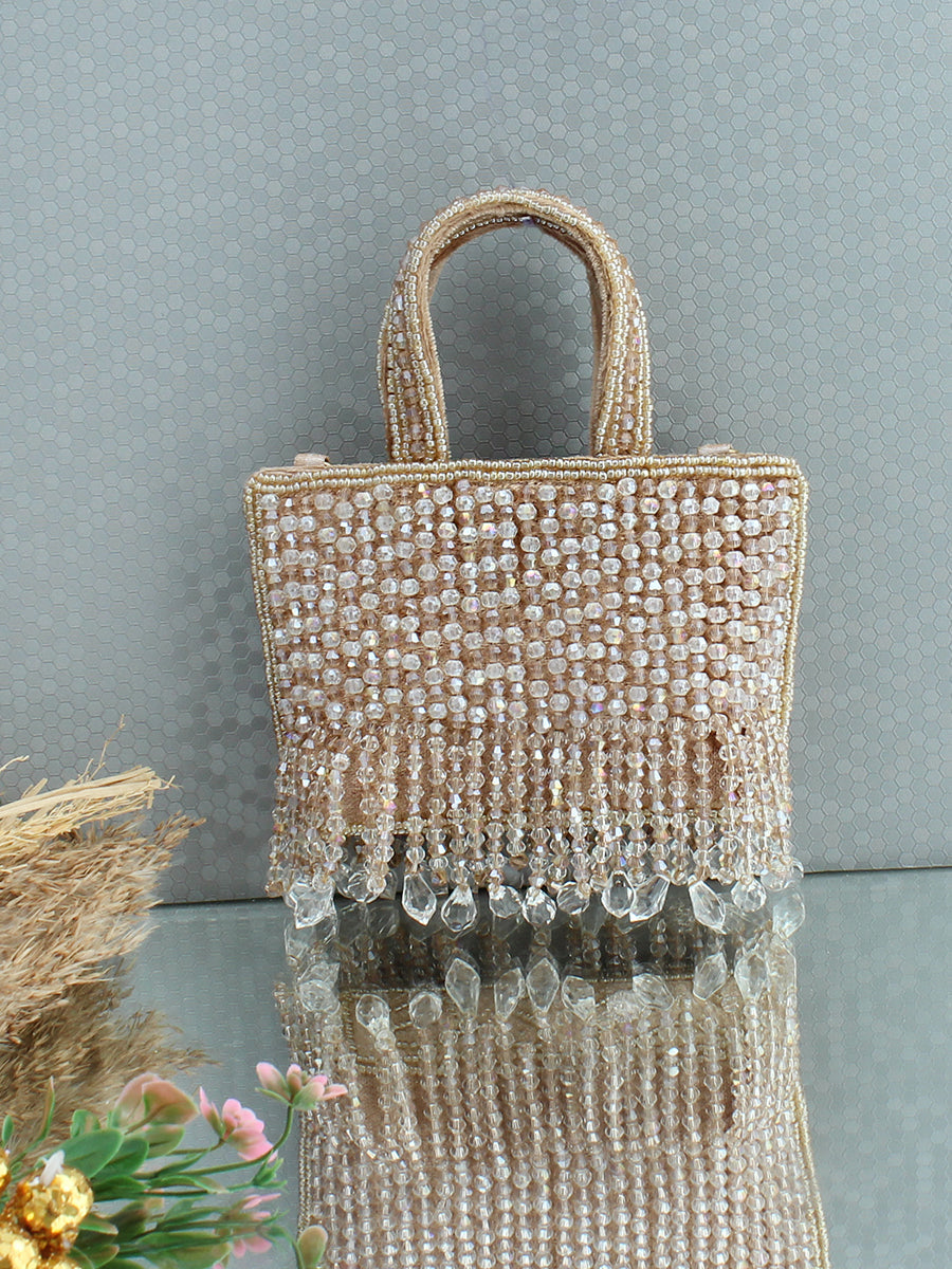 Presenting our gorgeous Mini Handbag, exquisitely adorned with shiny crystal beads that add a touch of elegance and sophistication. Crafted with meticulous attention to detail, this bag features an embellished handle with a detachable golden shoulder chain, that enhances its stylish and charming look. Equipped with a secure zip closure, it offers both convenience and peace of mind, ensuring your belongings stay safe. Perfectly balancing beauty and practicality, this mini handbag is the ideal accessory to elevate any outfit.