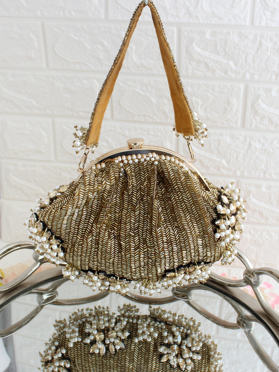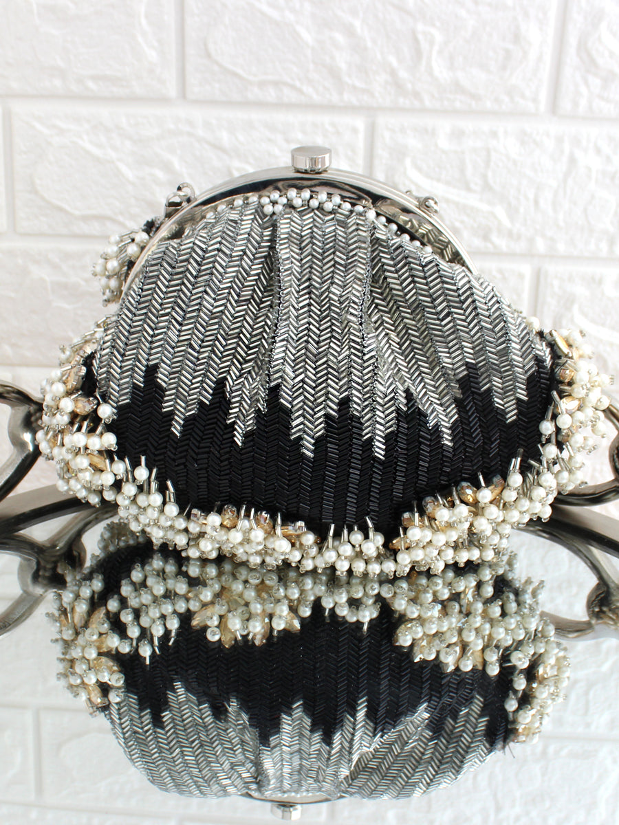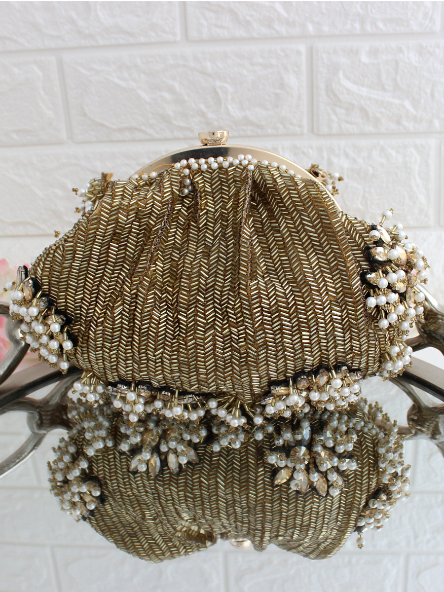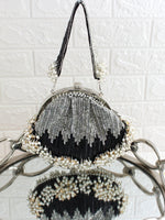 This clutch bag / batua soft pouch adorned with pearls, pipe glass beads and stones embroidery, It has a metal frame with a metallic clasp lock. It features an detachable strap. This bag can fit a smartphone, makeup, keys, currency and cards.