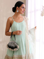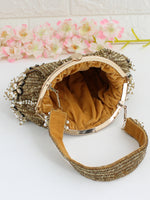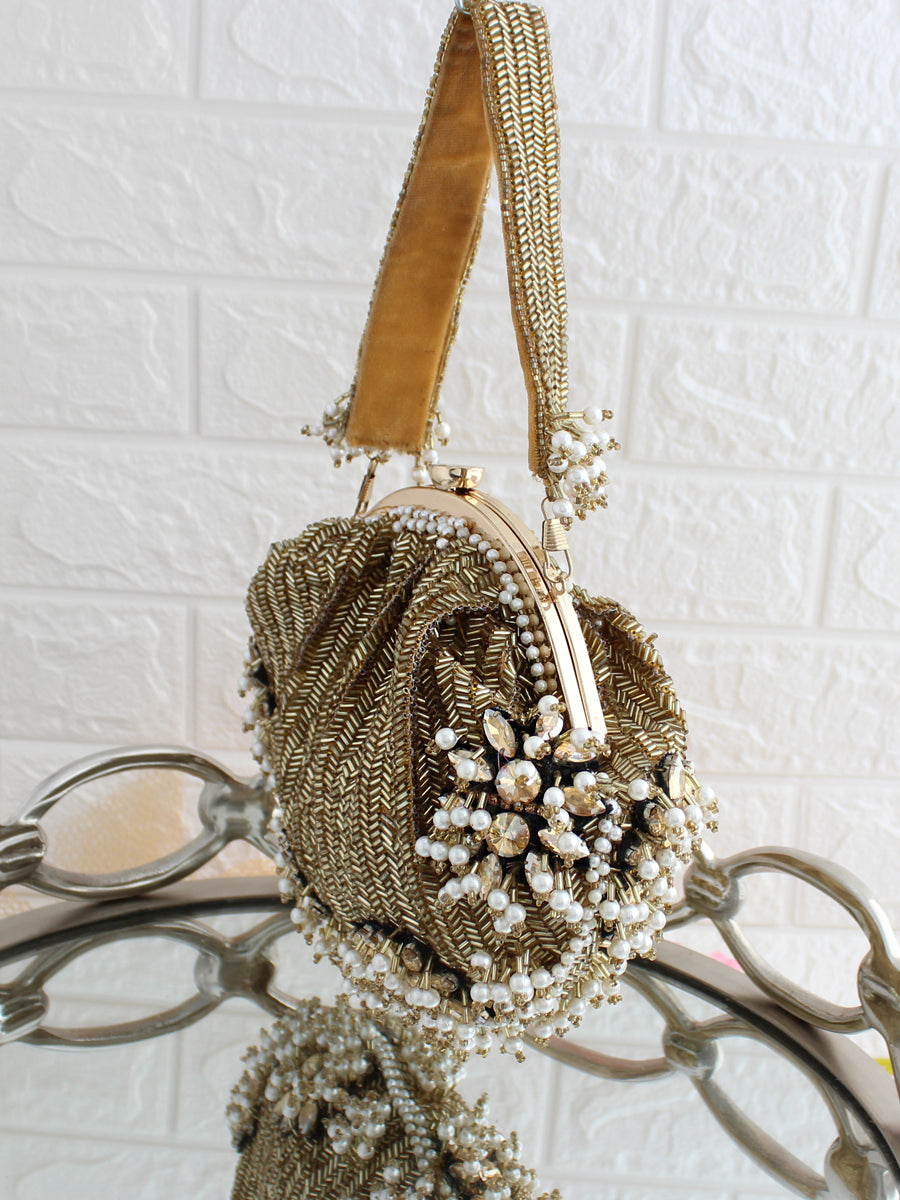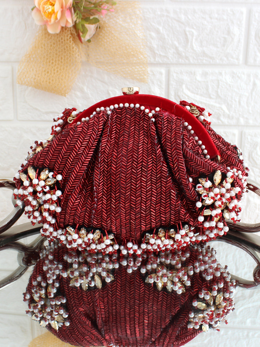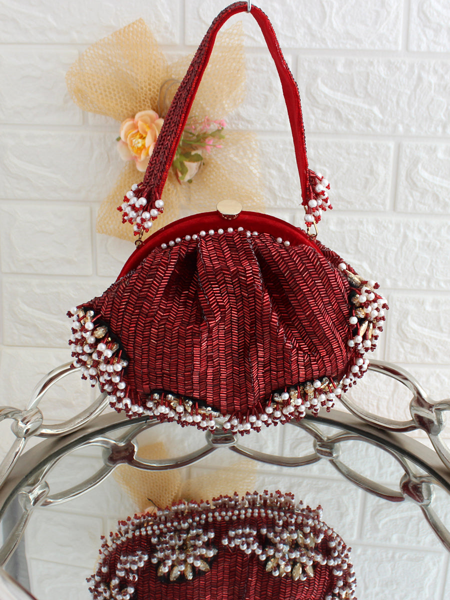 This clutch bag / batua soft pouch adorned with pearls, pipe glass beads and stones embroidery, It has a metal frame with a metallic clasp lock. It features an detachable strap. This bag can fit a smartphone, makeup, keys, currency and cards.