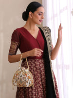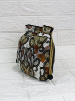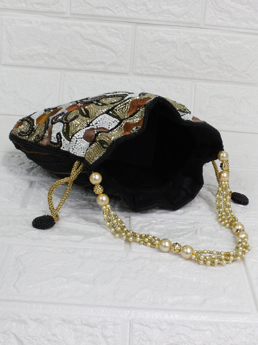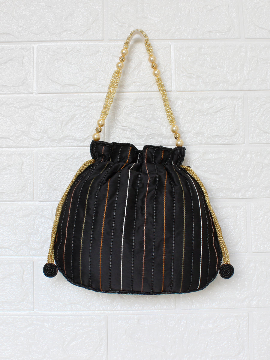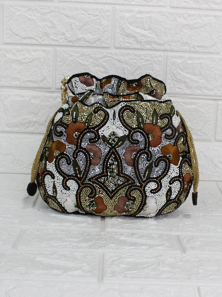 - Crafted from silk fabric material, this potli seamlessly combines style and functionality, making it an ideal accessory for various occasions. The drawstring closure adds a traditional touch, and the bead embellishments enhance the overall aesthetic, ensuring you make a statement wherever you go.