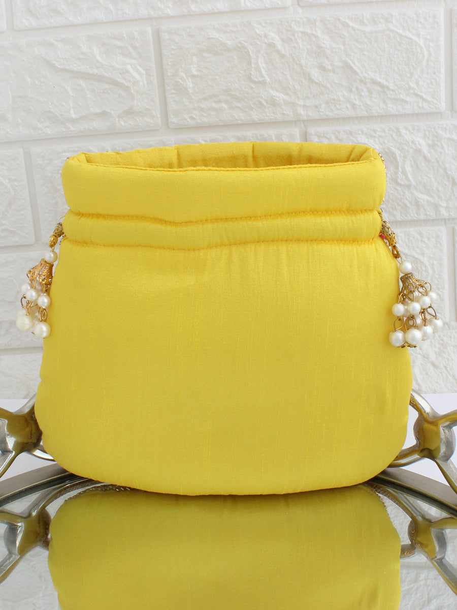 Presenting our Yellow Potli/Pouch Bag, adorned with pearls and crystal beads. Floral hand embroidery for a touch of elegance and sophistication. This exquisite potli is designed with meticulous attention to detail, featuring a string to tighten it and tassels at the end, providing a charming and stylish look. It is spacious enough to fit in your valuables such as a smartphone, makeup, keys, currency, and cards.