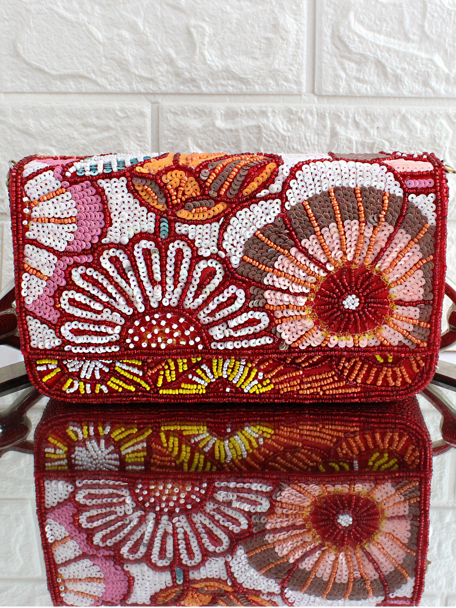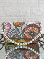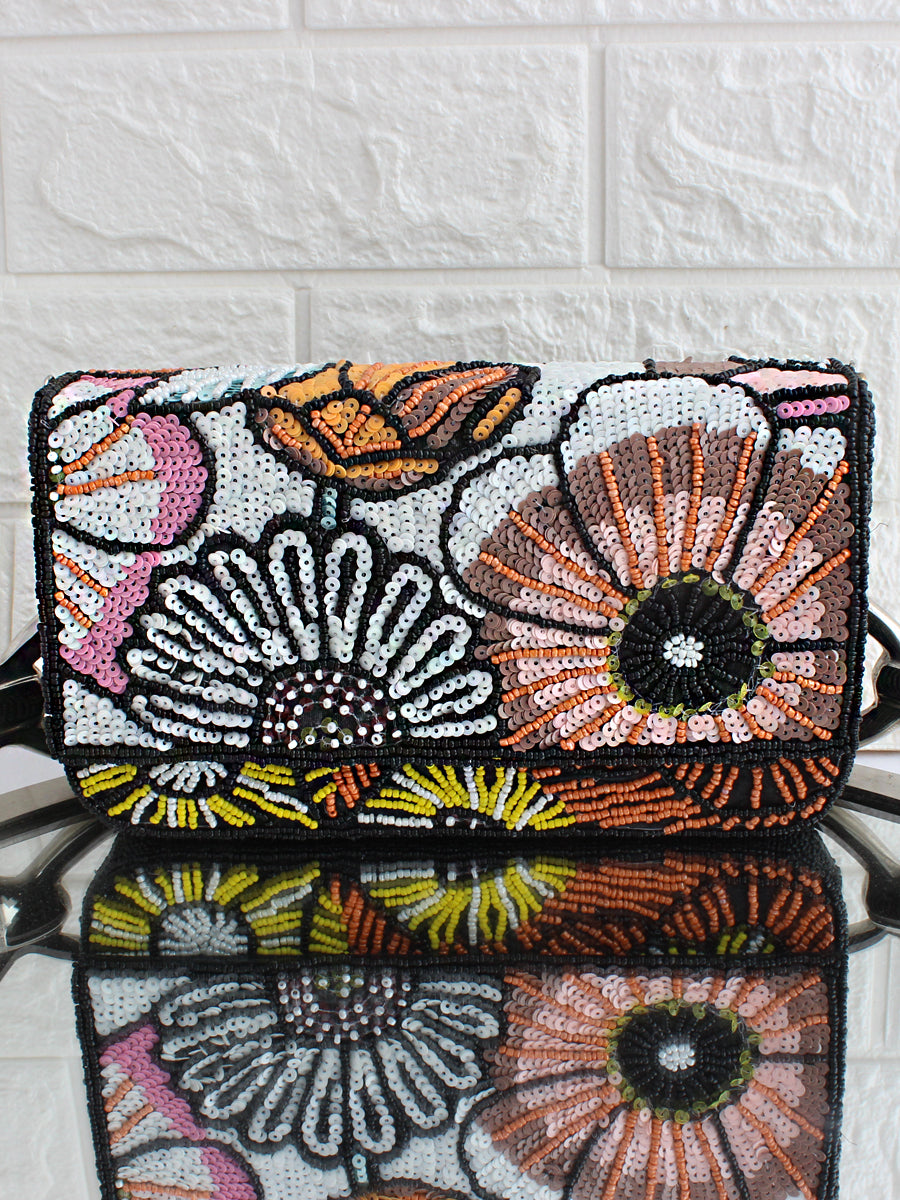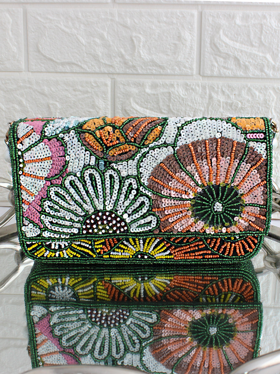 This velvet flap over bag /clutch / purse adorned with multi color beads and sequins work, the bag has a magnetic closure and an optional detachable Pearl string. this collectible statement accessory fits in your valuables like a smartphone, makeup, keys, currency and cards.
