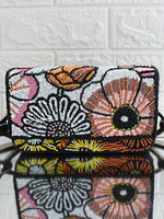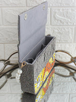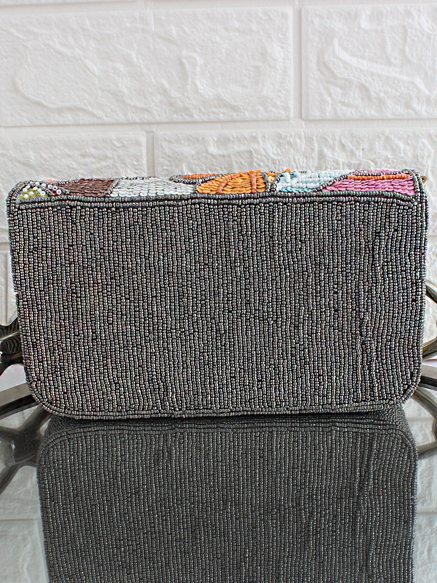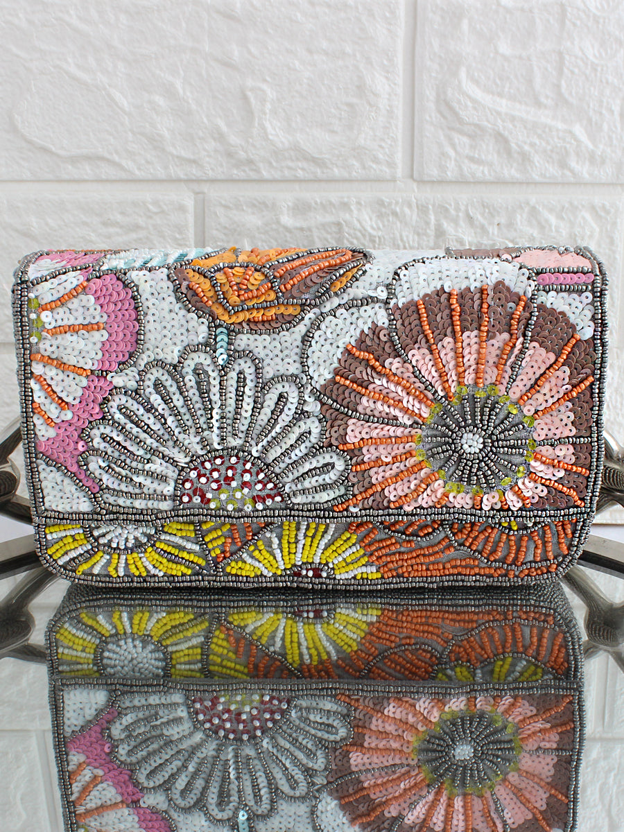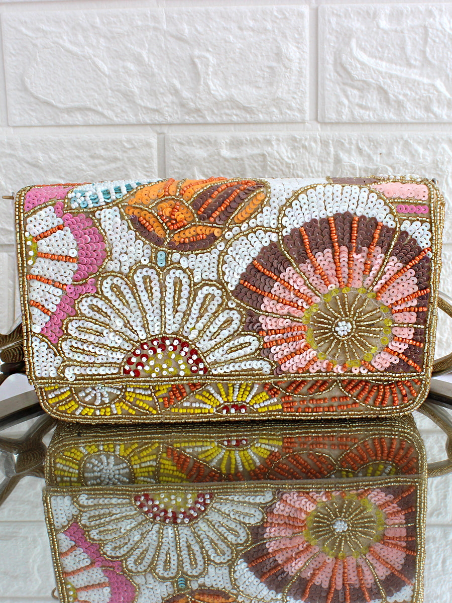 This velvet flap over bag /clutch / purse adorned with multi color beads and sequins work, the bag has a magnetic closure and an optional detachable Pearl string. this collectible statement accessory fits in your valuables like a smartphone, makeup, keys, currency and cards.