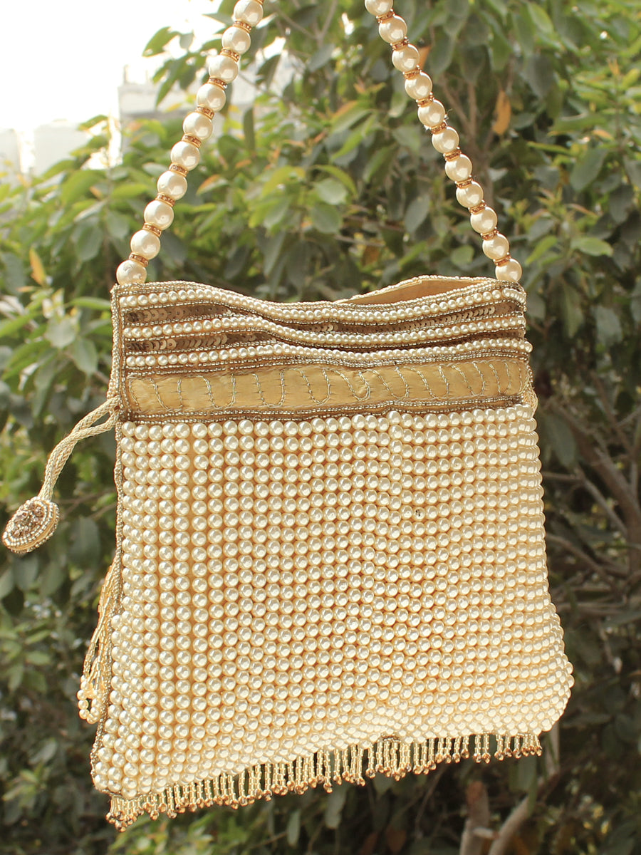 - This potli/pouch bag adorned with CZs, Sequins, Beads and Pearl Work, the potli Bag has a magnetic closure and comes with a Pearl Golden String to Tighten it.