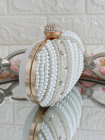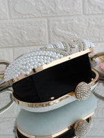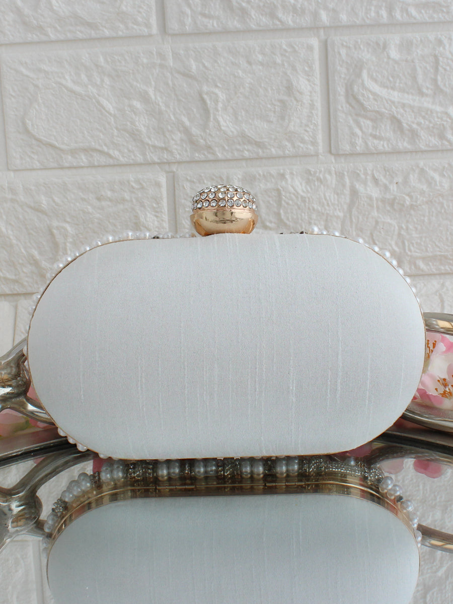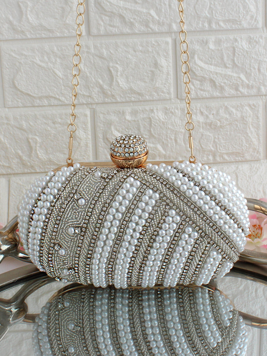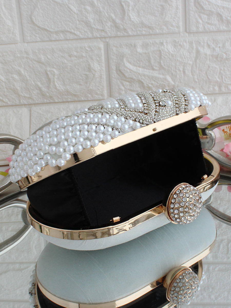This clutch bag box adorned with pearls, beads & CZs, It has a metal frame with a metallic clasp lock. It features an optional golden chain shoulder strap. This bag can fit a smartphone, makeup, keys, currency and cards.