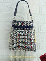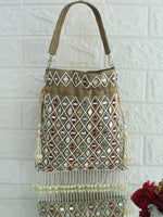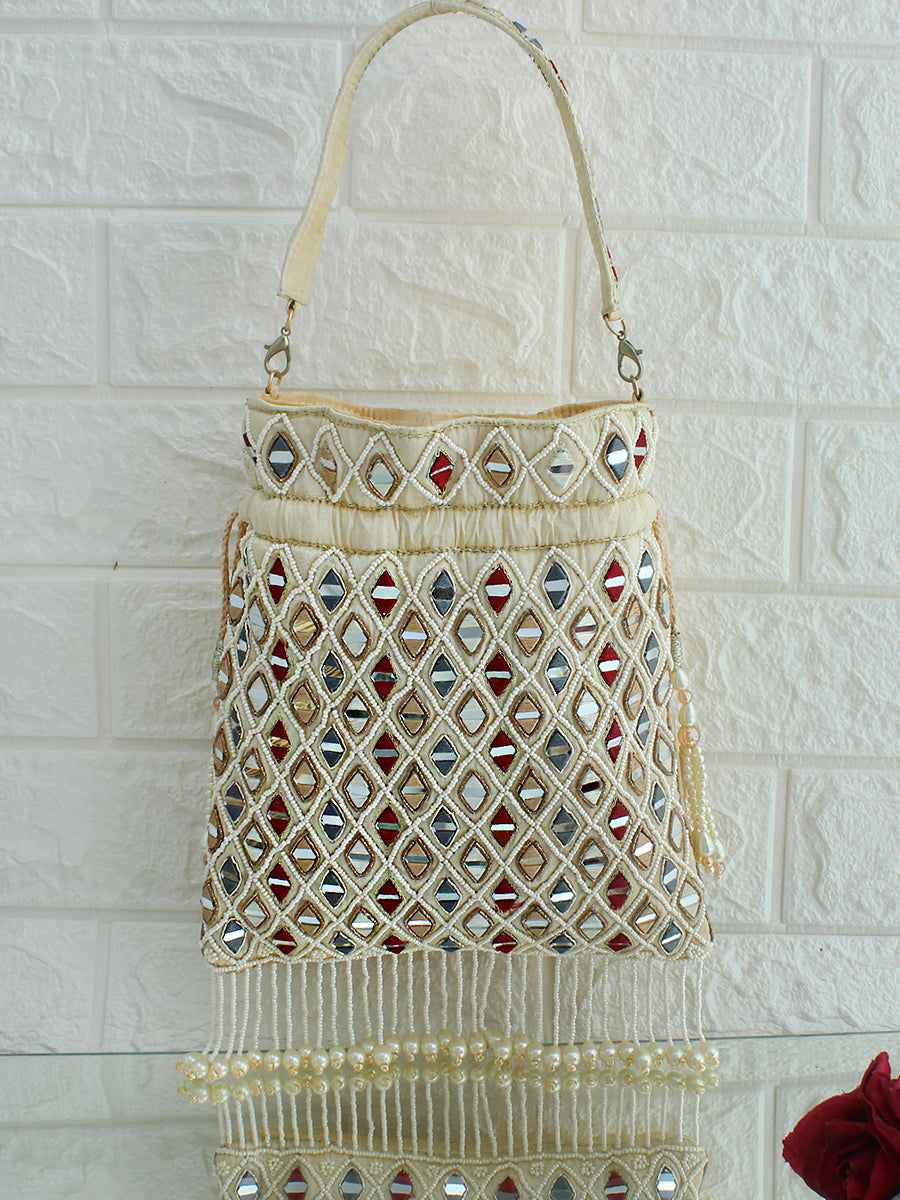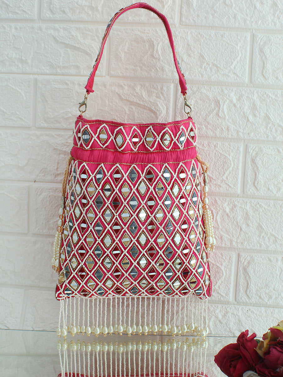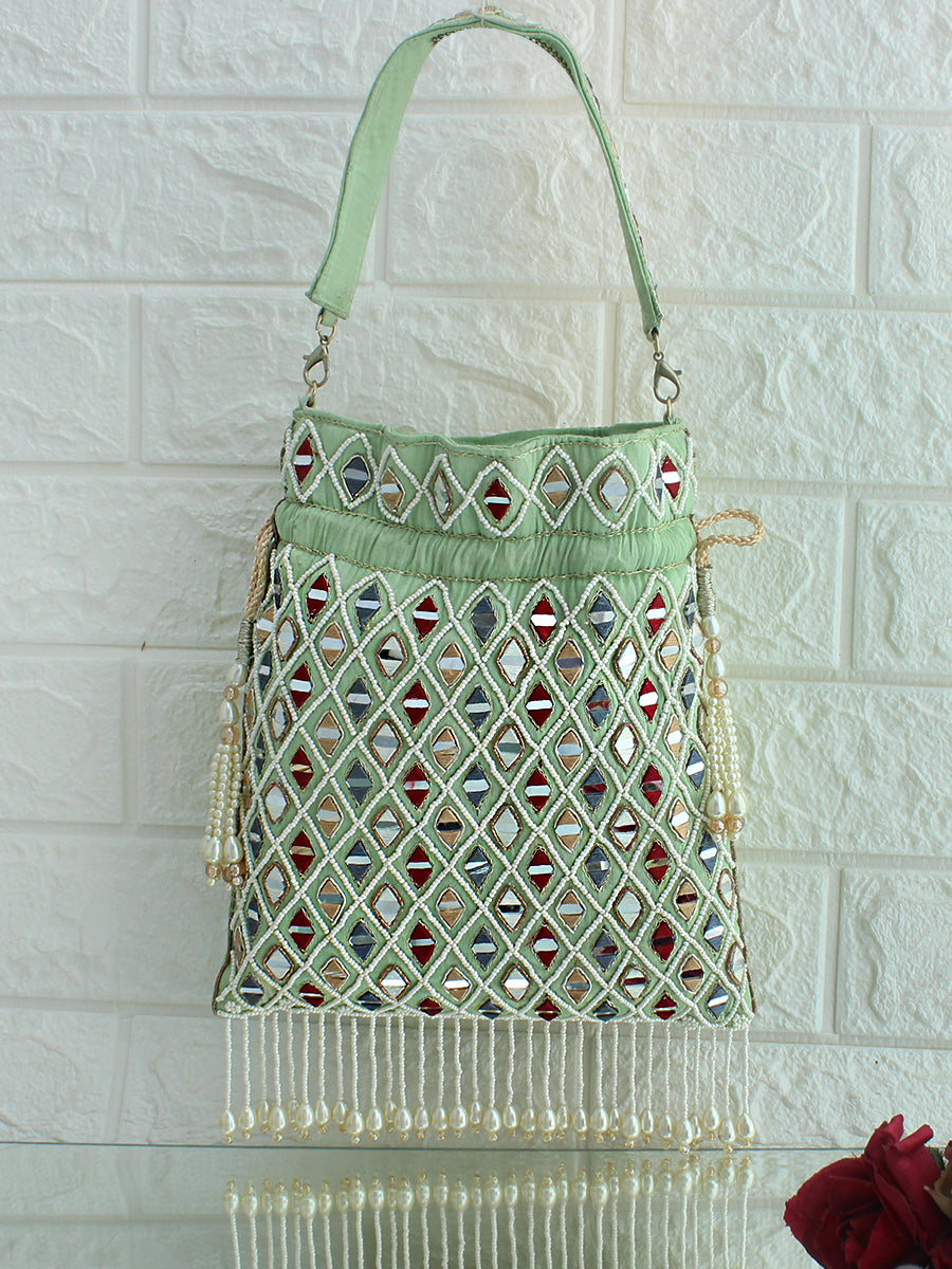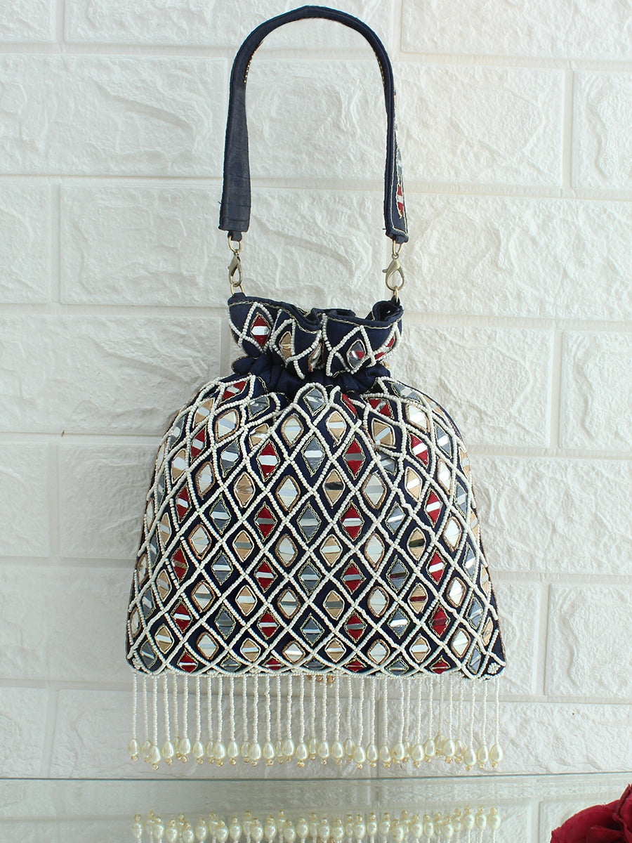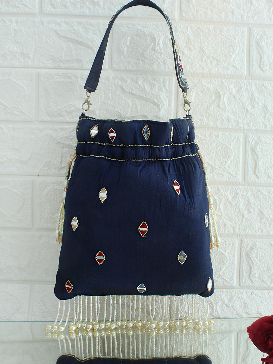 Introducing our Potli/Pouch Bag, a stunning accessory that combines traditional craftsmanship with contemporary style. Adorned with intricate mirrors, zari, multicolor threads, and beads, this exquisite potli bag adds an elegant and sophisticated touch to any outfit. Crafted with meticulous attention to detail, it features a secure drawstring closure and tassels at the ends, creating a beautiful, stylish look. Spacious enough to hold your essentials such as a smartphone, makeup, keys, currency, and cards, it seamlessly blends beauty with functionality. Made from luxurious silk fabric, this potli bag is perfect for various occasions. The traditional drawstring closure, paired with dazzling mirror embellishments, ensures you make a bold and unforgettable statement wherever you go.