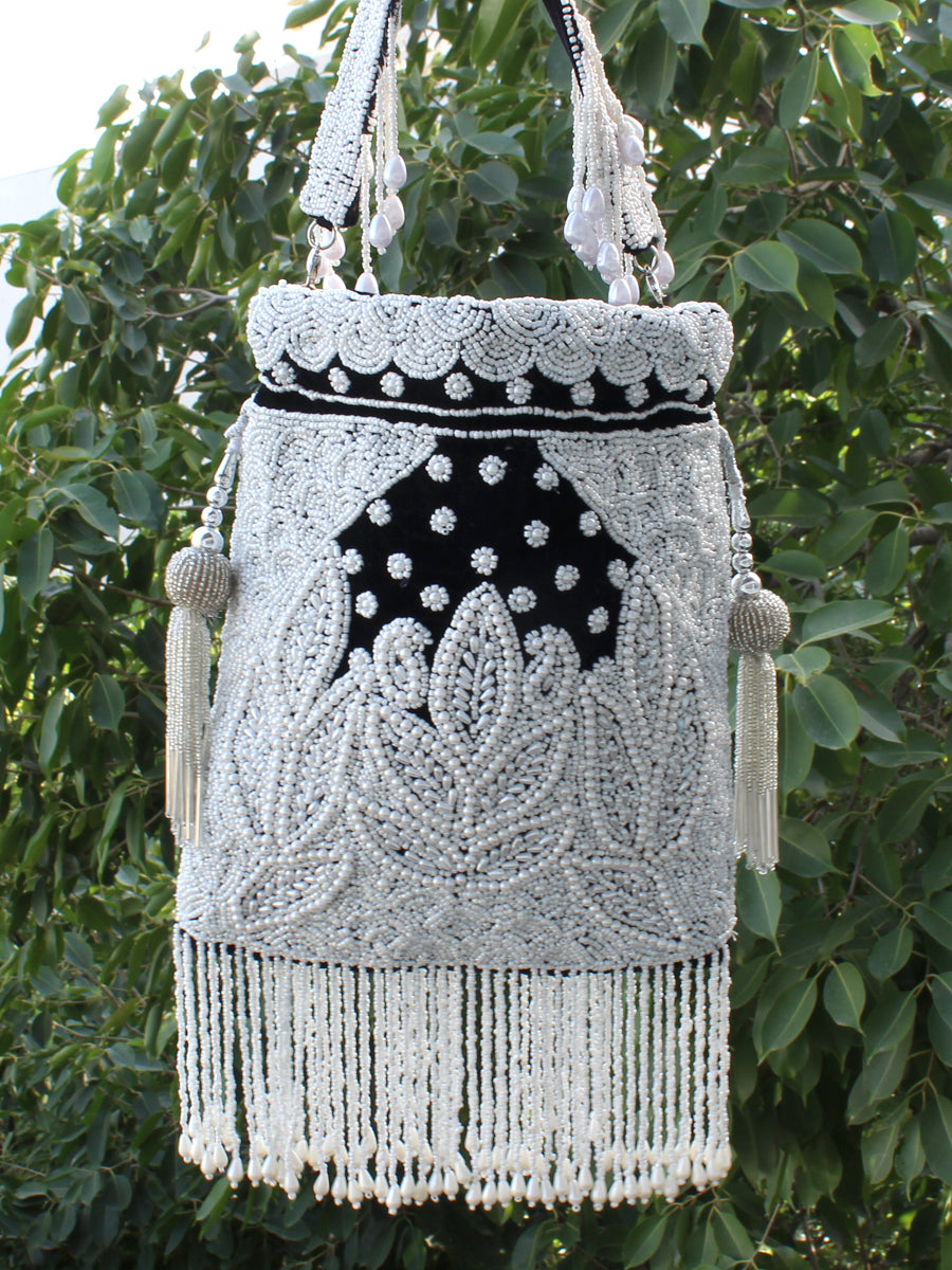 - Crafted from luxurious velvet material, this potli seamlessly combines style and functionality, making it an ideal accessory for various occasions. The drawstring closure adds a traditional touch, and the pearl beads embellishments enhance the overall aesthetic, ensuring you make a statement wherever you go.