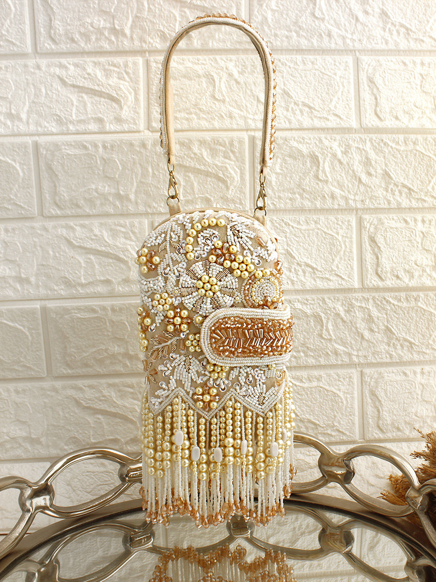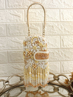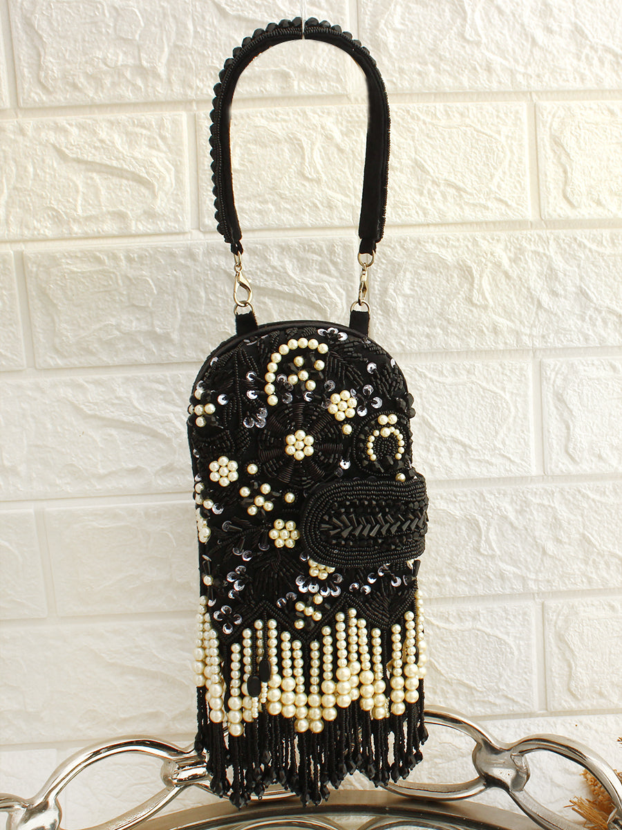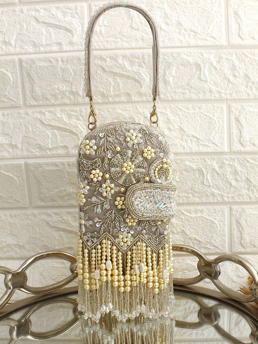 Experience the magic of vertical elegance. This one-of-a-kind clutch features a luxurious velvet base, embellished handle, and captivating pearl tassels that sway gracefully with every step. Its horizontal opening provides easy access to your essentials, while its intricate embroidery adds a touch of luxury.