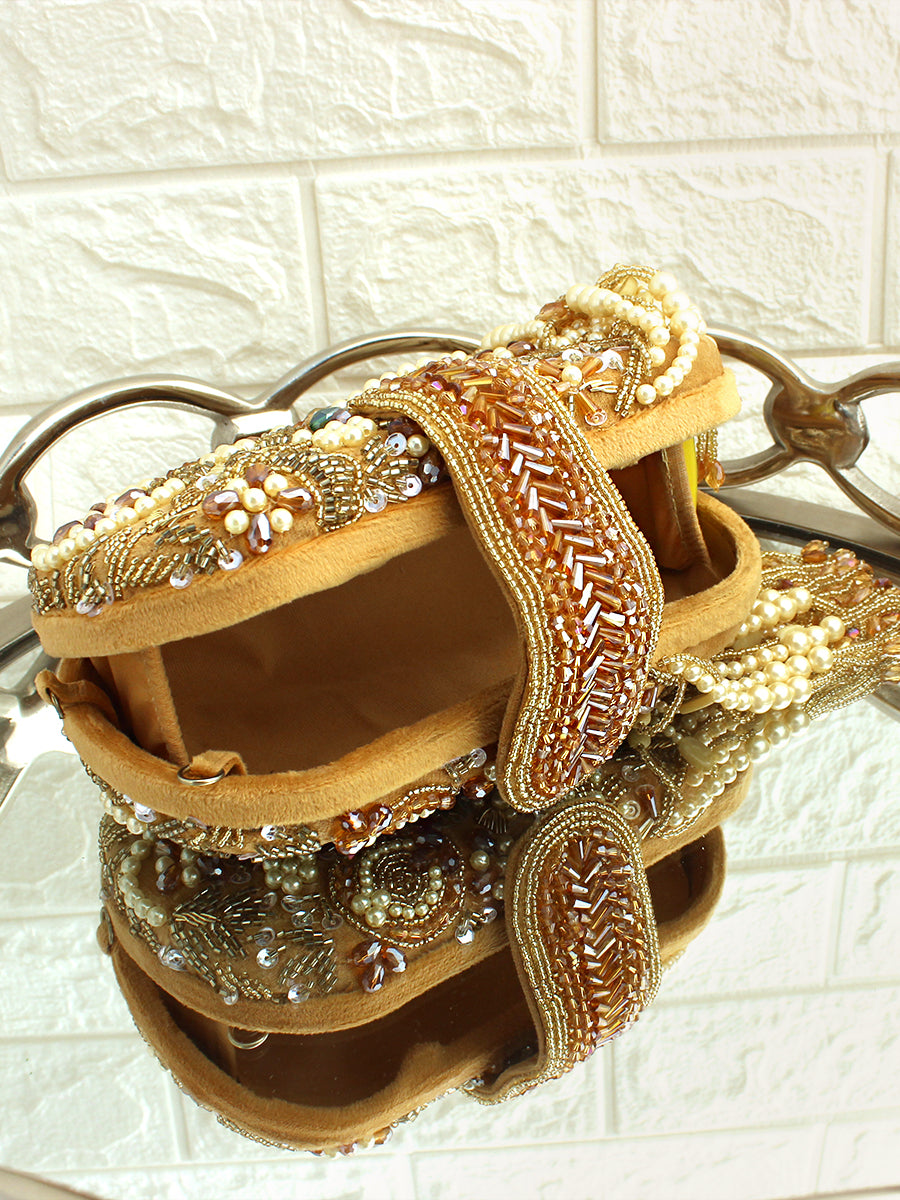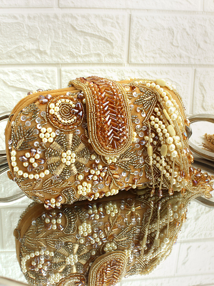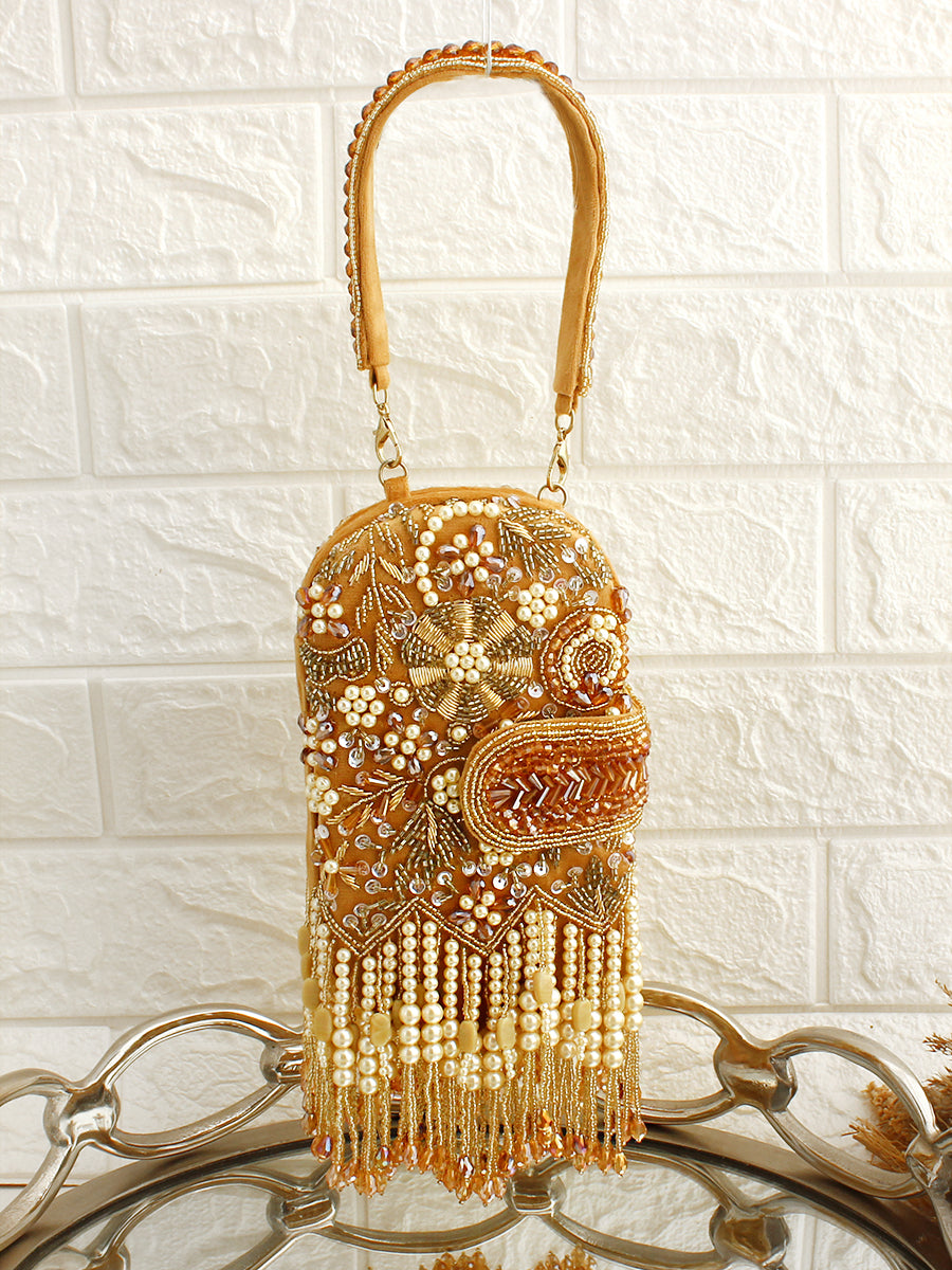 Experience the magic of vertical elegance. This one-of-a-kind clutch features a luxurious velvet base, embellished handle, and captivating pearl tassels that sway gracefully with every step. Its horizontal opening provides easy access to your essentials, while its intricate embroidery adds a touch of luxury.