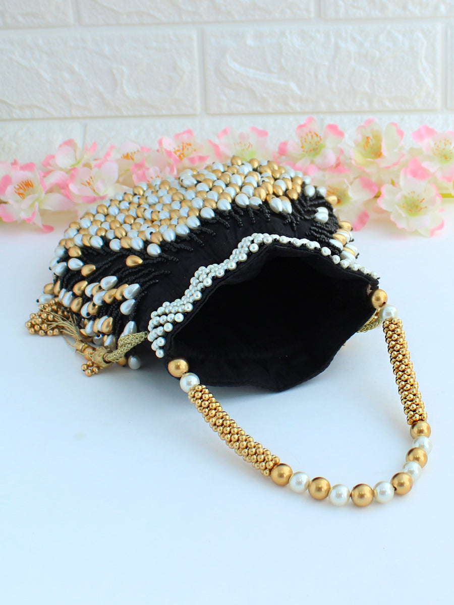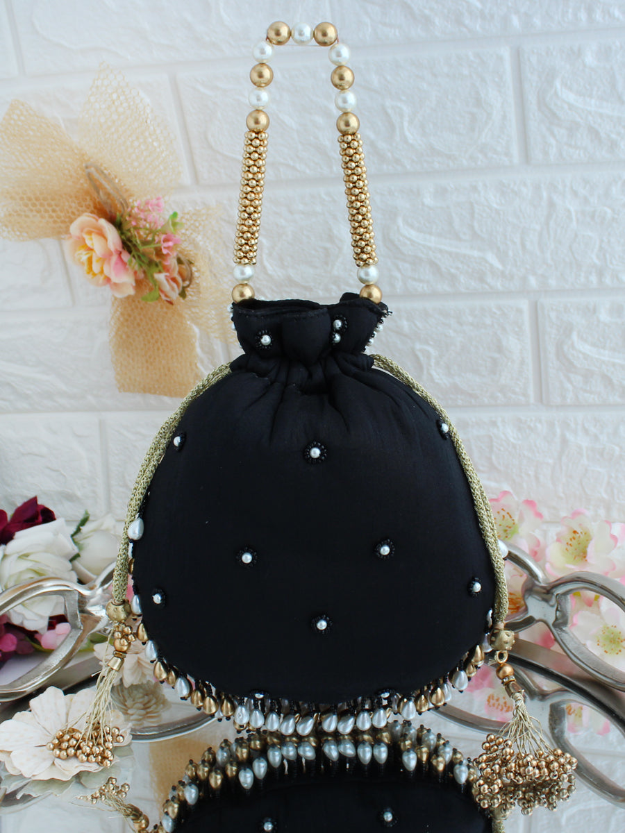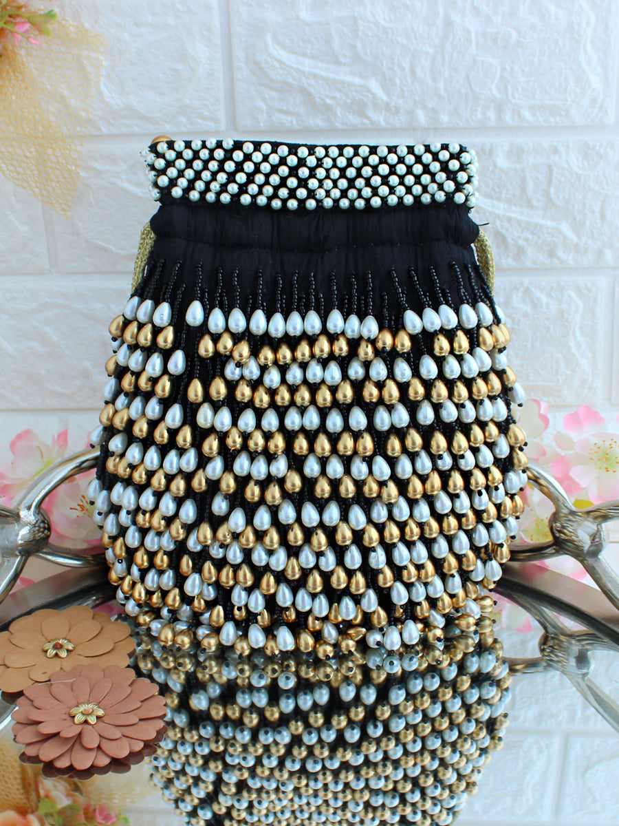 - Crafted from silk fabric material, this potli seamlessly combines style and functionality, making it an ideal accessory for various occasions. The drawstring closure adds a traditional touch, and the pearl & gold bead embellishments enhance the overall aesthetic, ensuring you make a statement wherever you go.