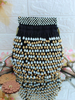 Presenting our Silk Potli/Pouch Bag adorned with white and golden pearl drops. The Pearl drops are on the front of the bag and the back has scattered embroidery on fabric. This exquisite potli is designed with meticulous attention to detail, featuring a string to tighten it and tassels at the end, providing a charming and stylish look. It is spacious enough to fit in your valuables such as a smartphone, makeup, keys, currency, and cards.