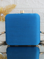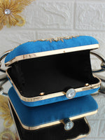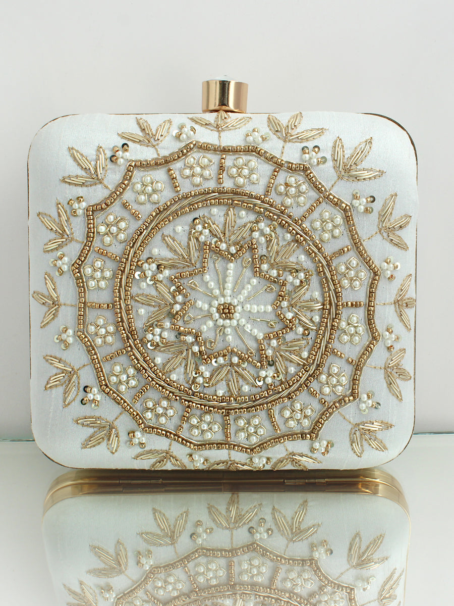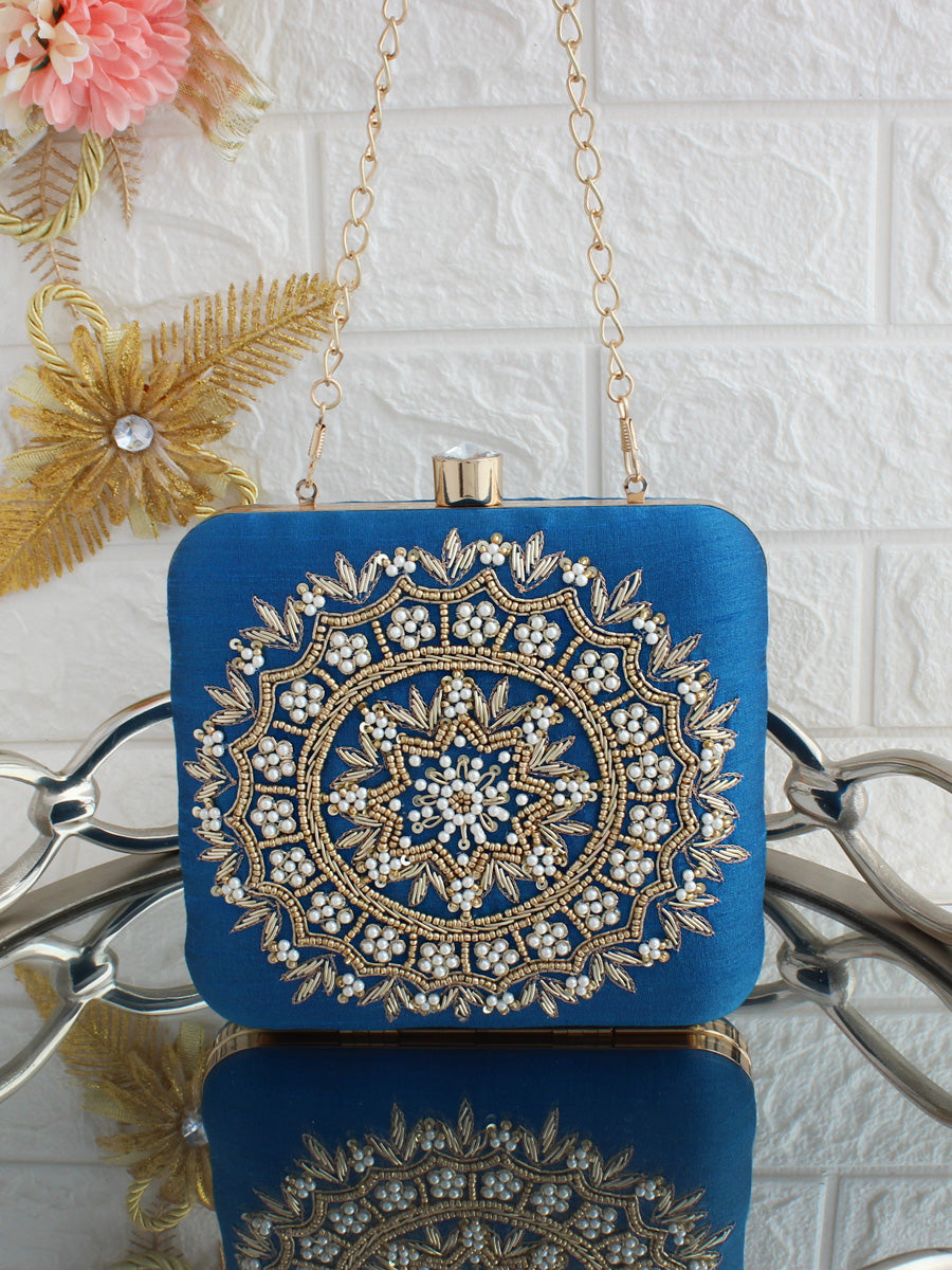 This square shape clutch bag box adorned with Pearls and golden zardozi salma work, it has a metal frame with a metallic clasp lock. It features an optional golden chain shoulder strap. This bag can fit a smartphone, makeup, keys, currency and cards.