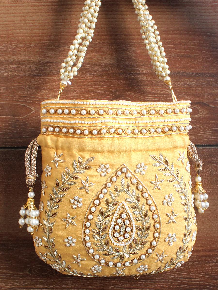 - This potli/pouch bag is adorned with Faux Pearls, Zari, & Salma Work. The potli comes with a string to tighten it and has Pearl Tassels in the end.