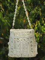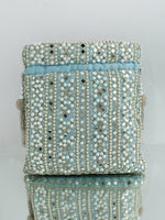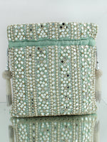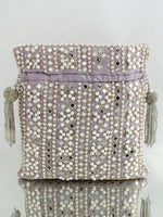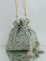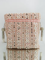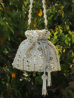 Presenting our Pastel color Potli/Pouch Bag, adorned with pearls, sequins and mirrors, for a touch of elegance and sophistication. This exquisite potli is designed with meticulous attention to detail, featuring a string to tighten it and tassels at the end, providing a charming and stylish look. It is spacious enough to fit in your valuables such as a smartphone, makeup, keys, currency, and cards.