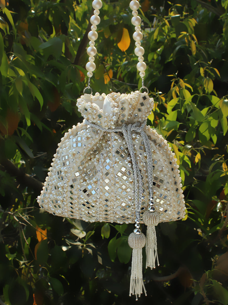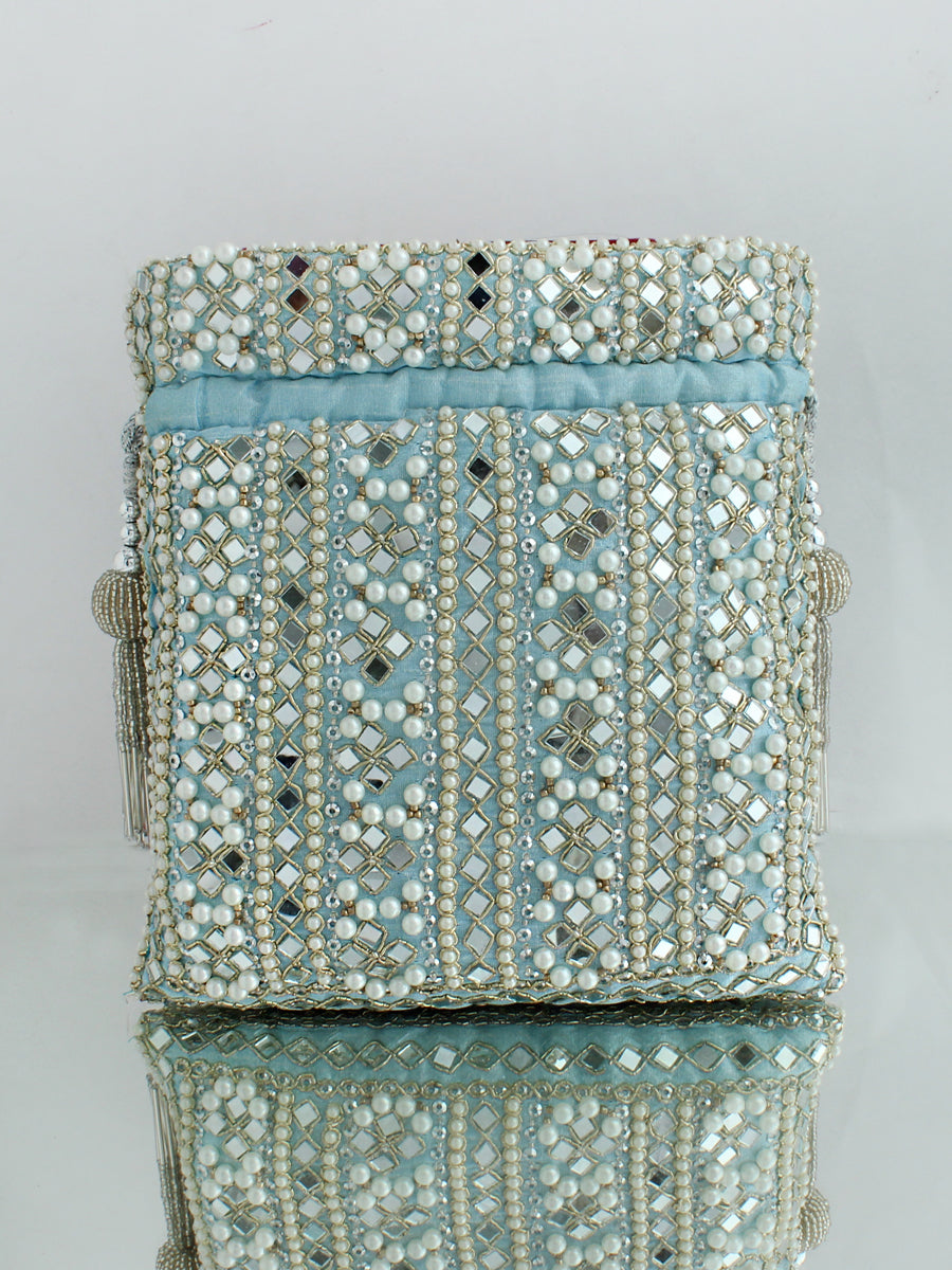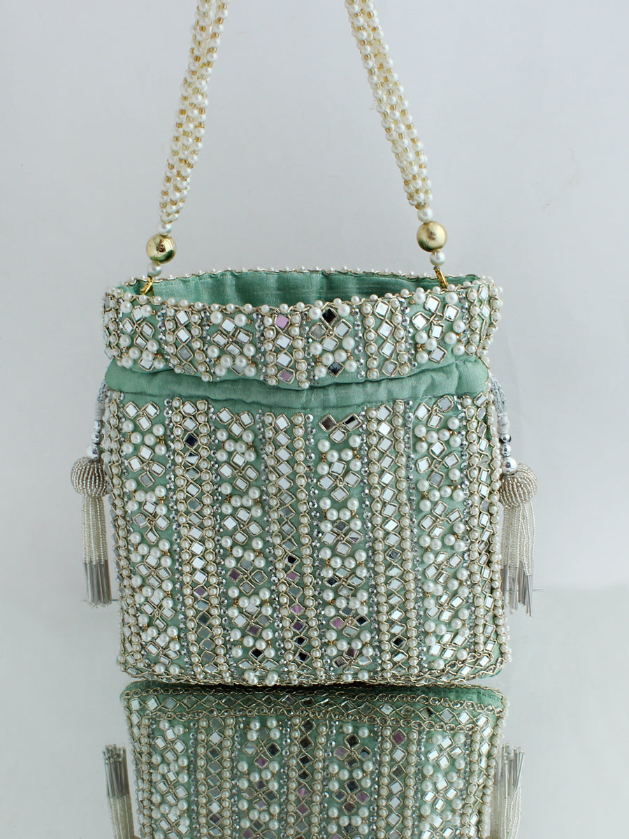 - Crafted from silk fabric material, this potli seamlessly combines style and functionality, making it an ideal accessory for various occasions. The drawstring closure adds a traditional touch, and the mirrors embellishments enhance the overall aesthetic, ensuring you make a statement wherever you go.