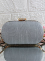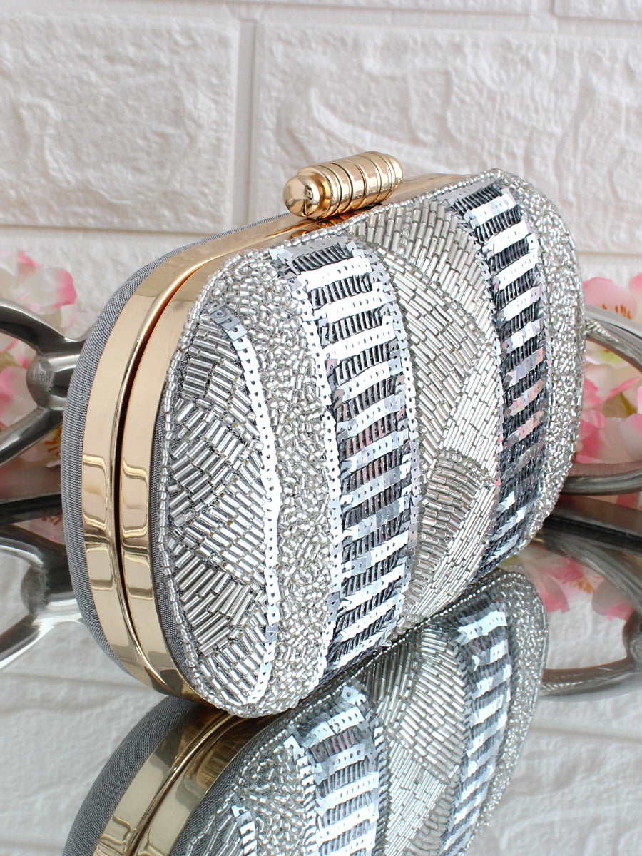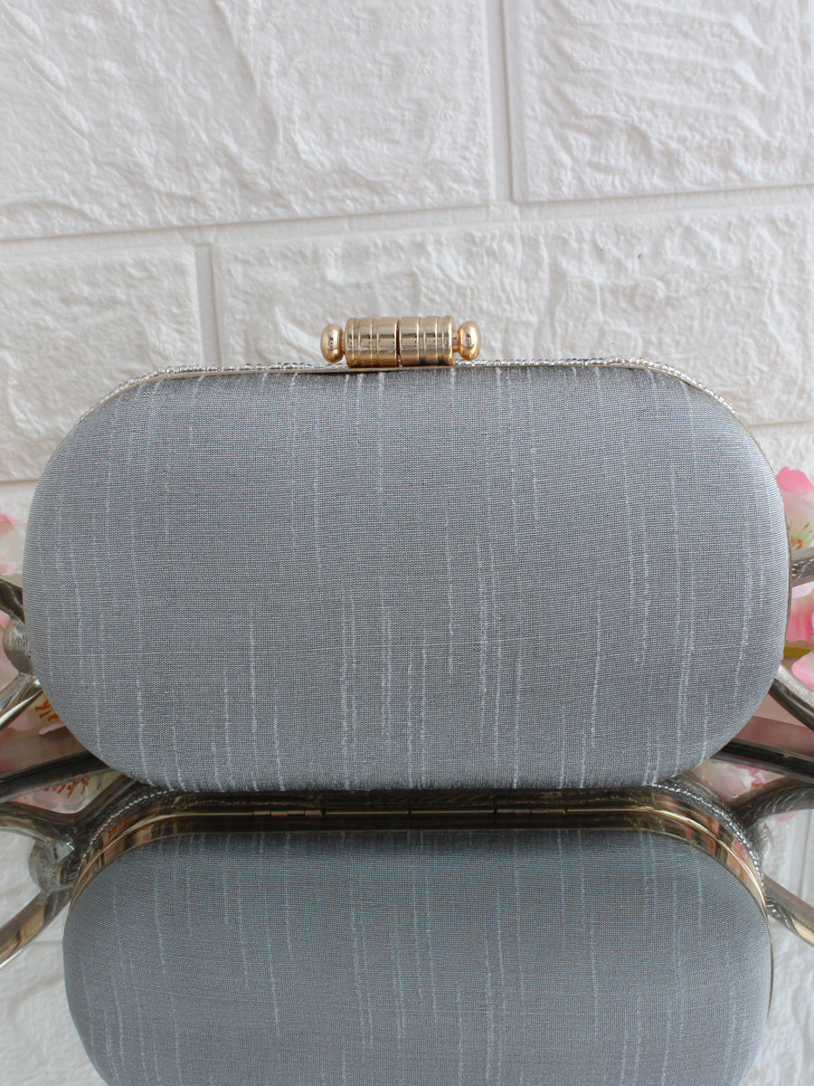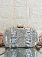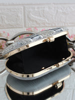 This clutch bag box adorned with sequins and beads work, It has a metal frame with a metallic clasp lock. It features an optional golden chain shoulder strap. This bag can fit a smartphone, makeup, keys, currency and cards.