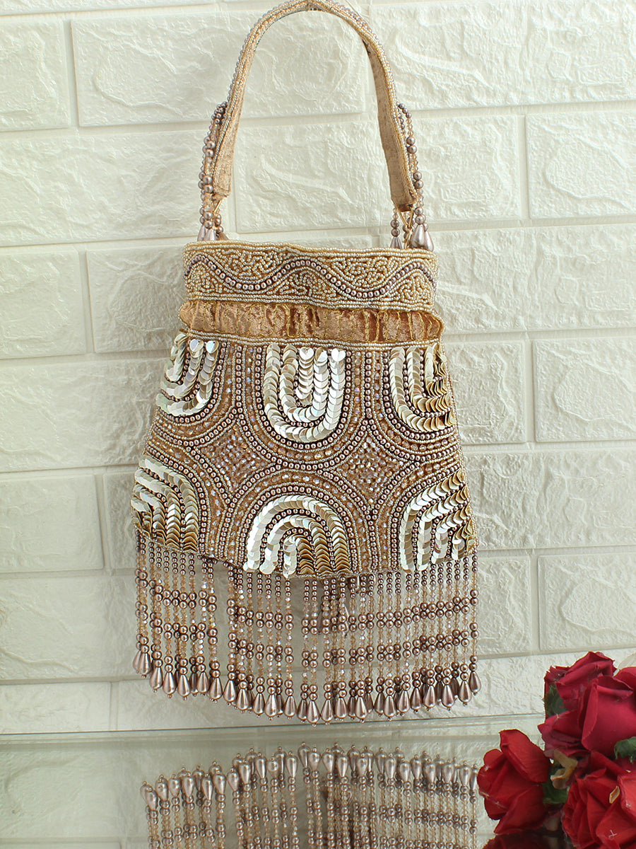 This dazzling potli bag, adorned with intricate hand embroidery featuring shimmering sequins, beads, and faux pearls, is a showstopper for any special occasion. The embellished handle adds an extra layer of elegance, while the meticulously hand-crafted sequin embroidery creates a luxurious texture. Complemented by stunning tassel pearls, this piece is both beautiful and functional. Despite its compact design, it offers enough space for your essentials, making it the perfect blend of style and practicality. Available in classic gold, ivory, black and silver, this potli bag is sure to make a statement wherever you go.