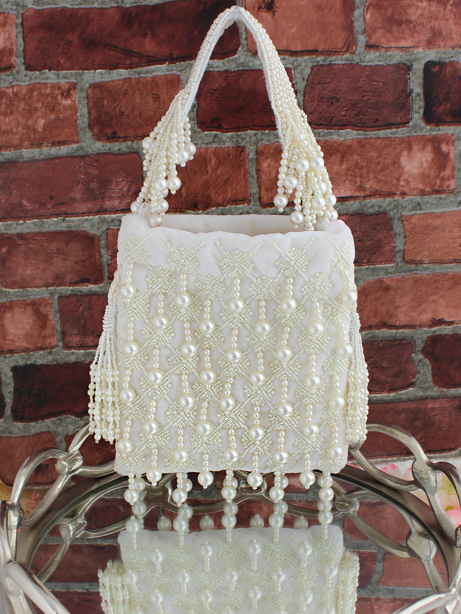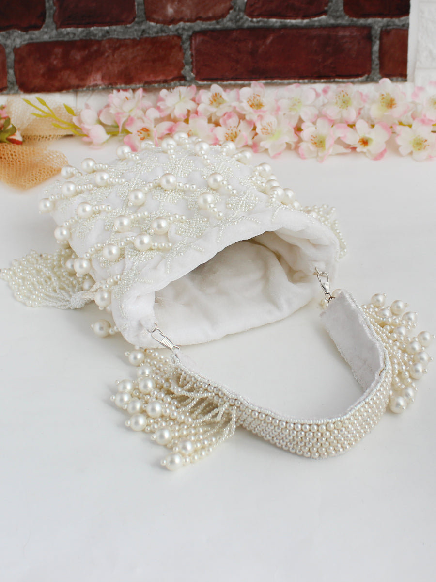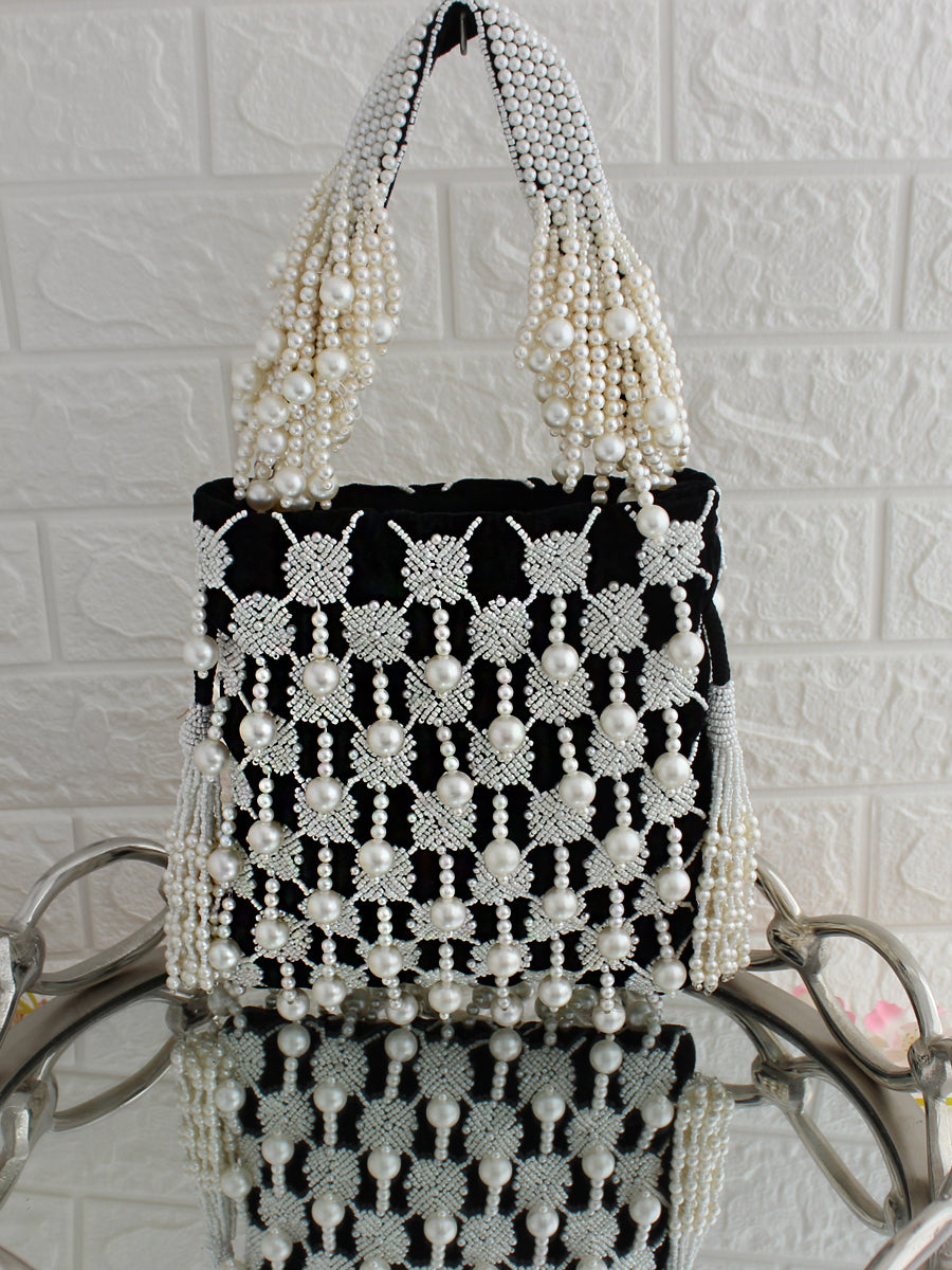 - Crafted from luxurious velvet material, this potli seamlessly combines style and functionality, making it an ideal accessory for various occasions. The drawstring closure adds a traditional touch, and the pearl bead embellishments enhance the overall aesthetic, ensuring you make a statement wherever you go.