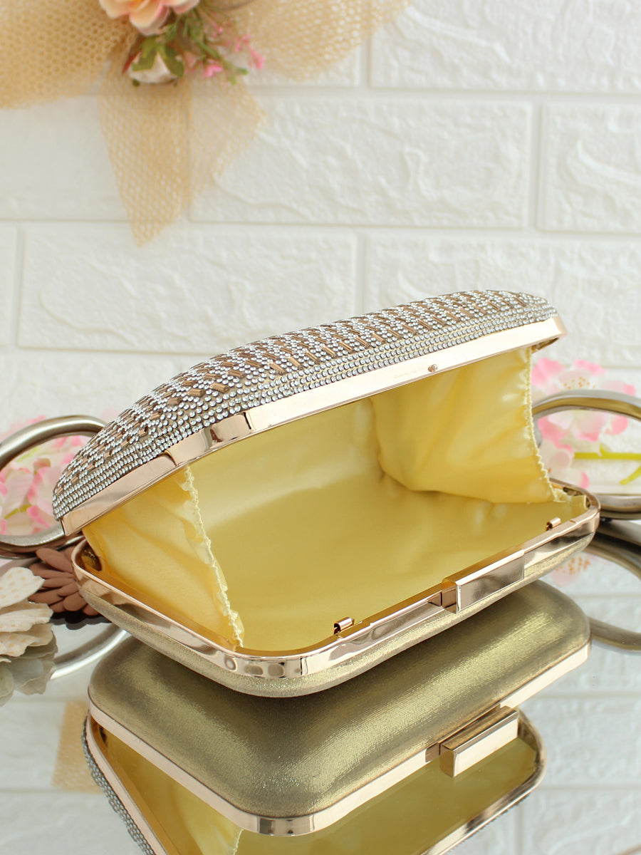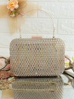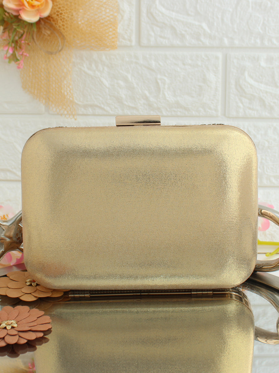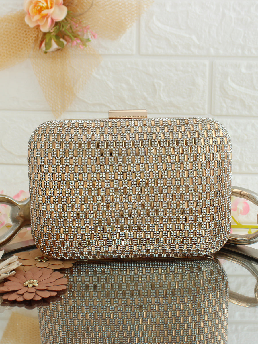 This golden clutch bag box is adorned with CZs and Pearls at the front and golden fabric at the back. It has a metal frame with a metallic clasp lock. It features an optional handle & golden chain shoulder strap. This bag can fit a smartphone, makeup, keys, currency and cards.