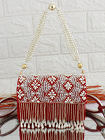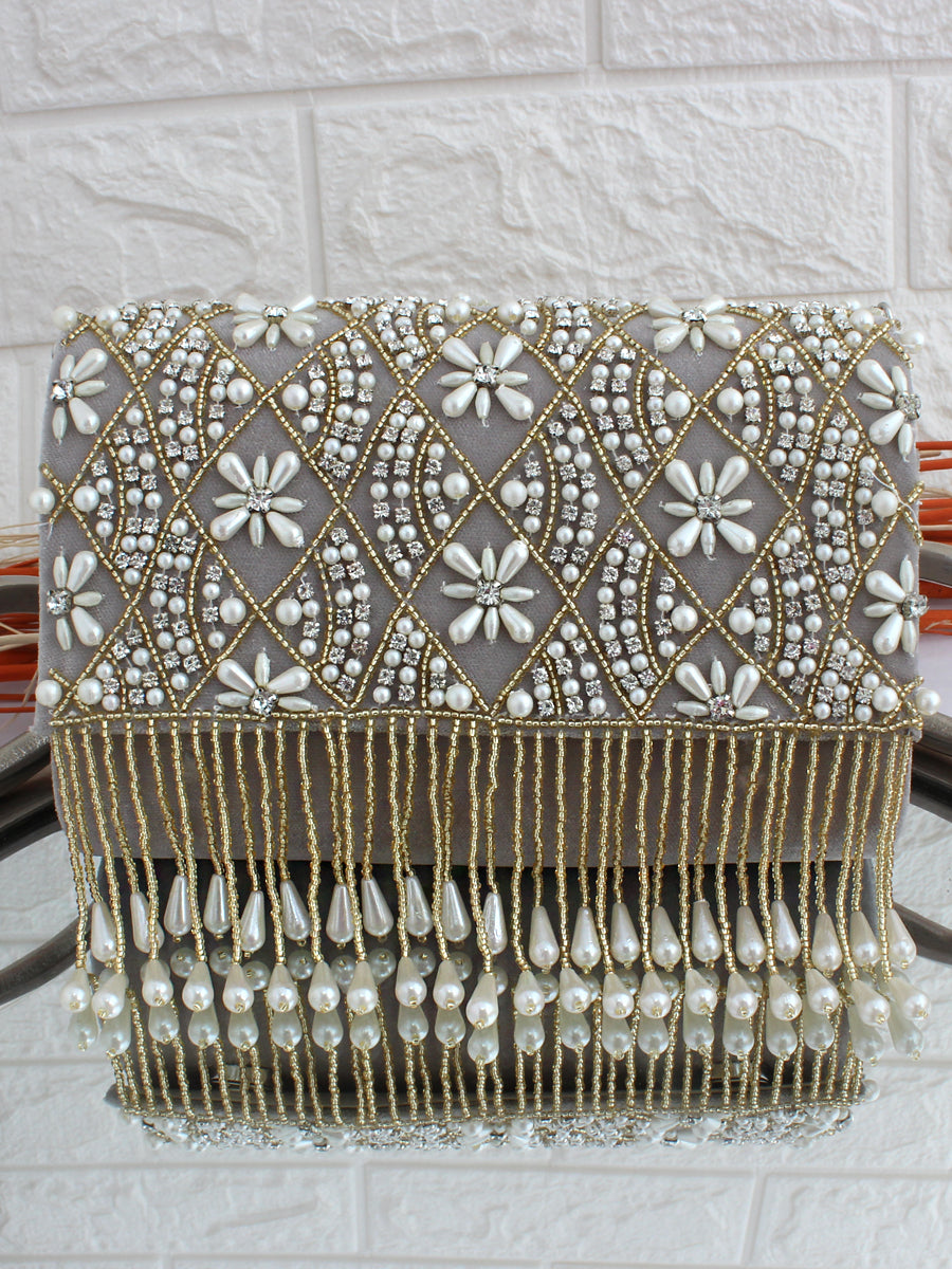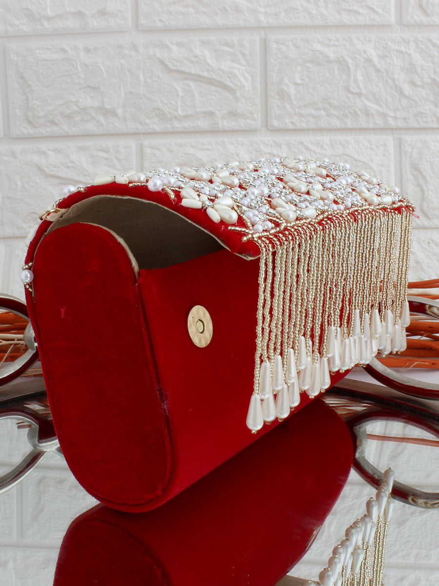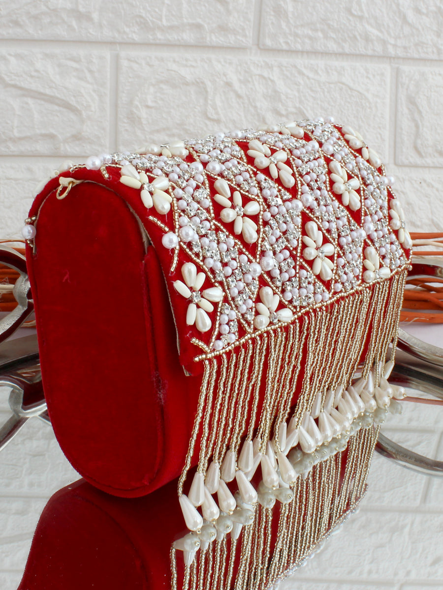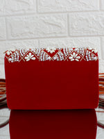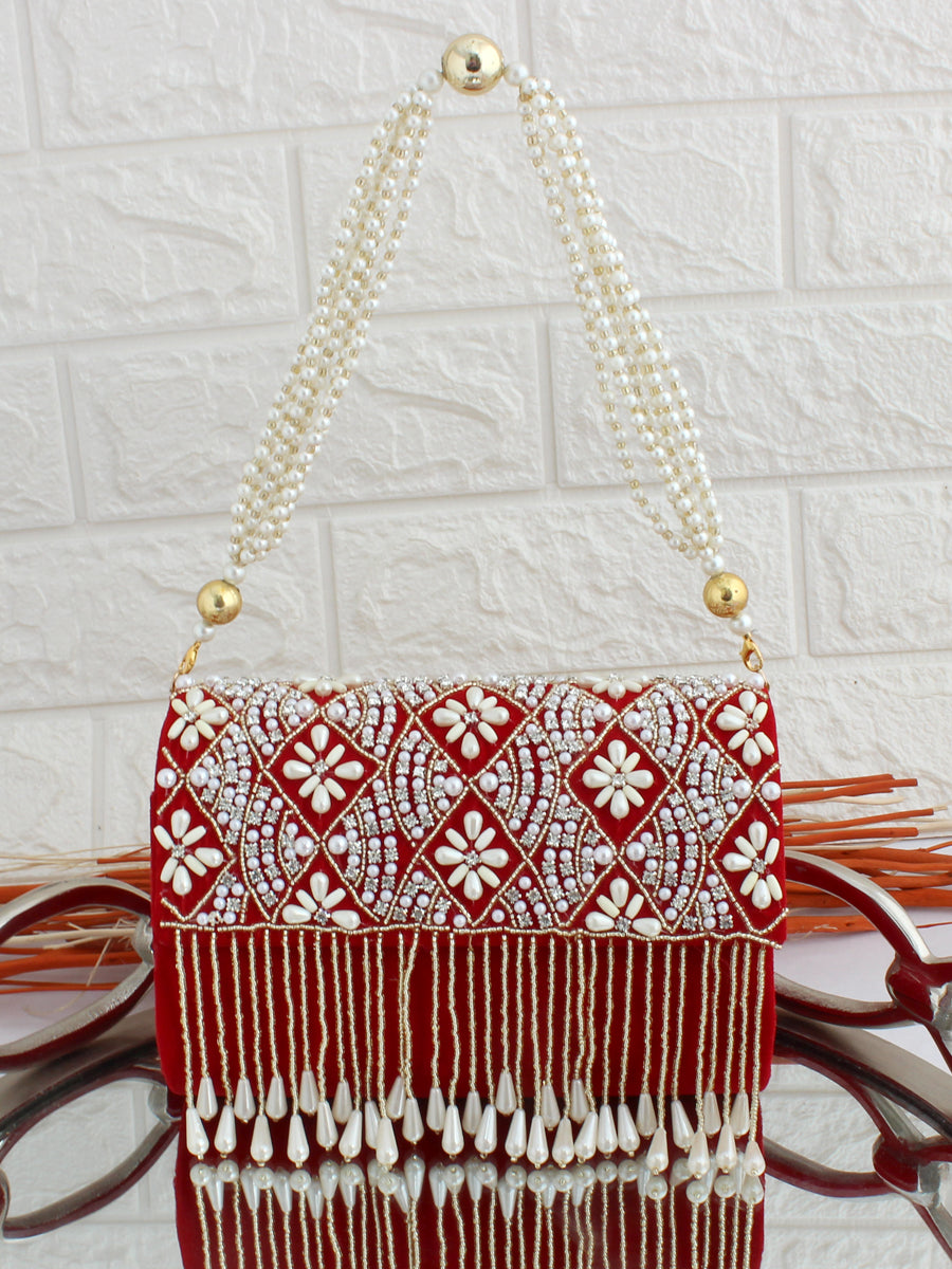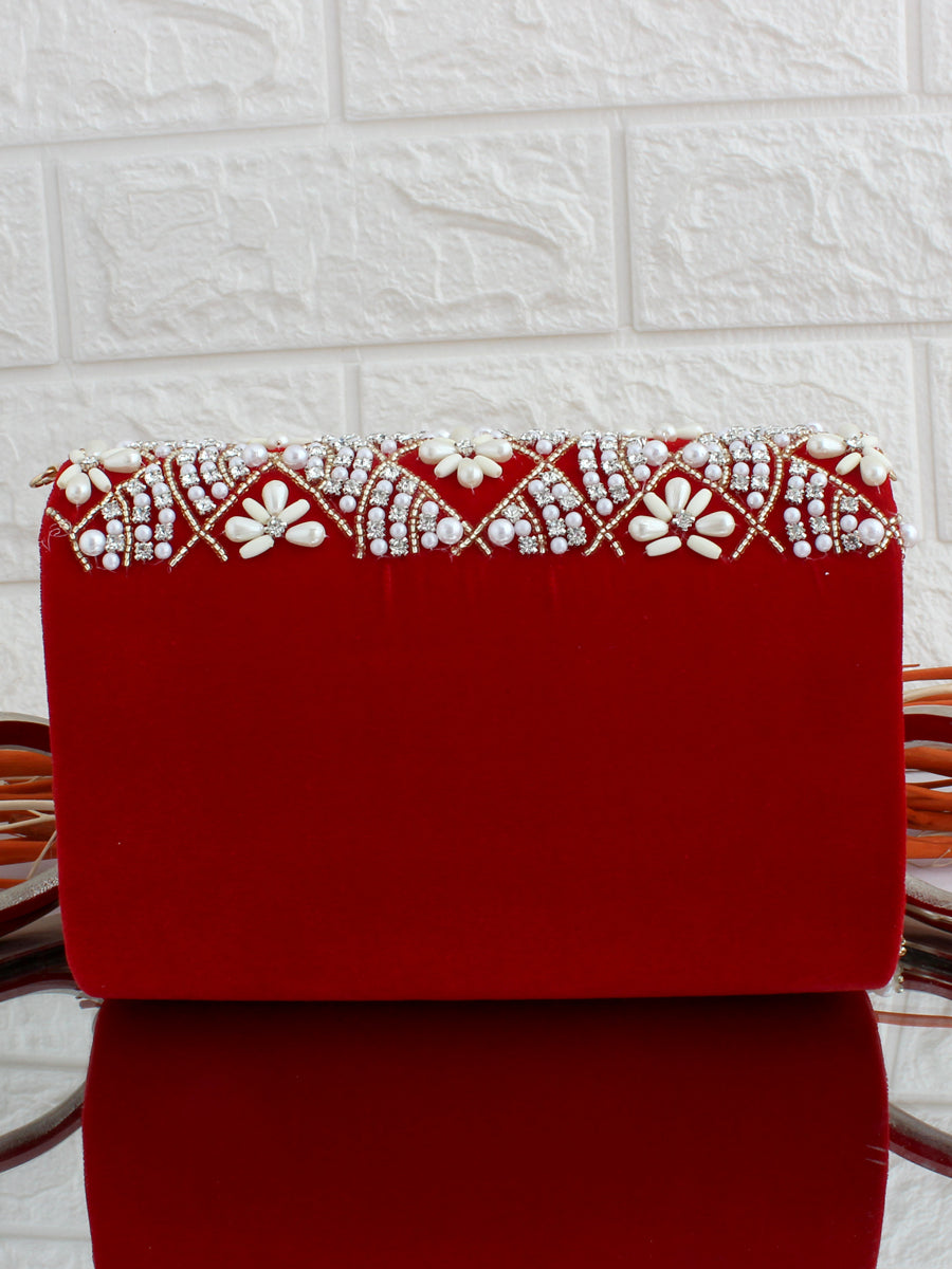 This velvet flap handbag/ clutch / purse adorned with CZ Stones, faux pearls and beads on the flap. The bag has a magnetic closure and detachable pearl string. this collectible statement accessory fits in your valuables like a smartphone, makeup, keys, currency and cards.