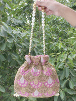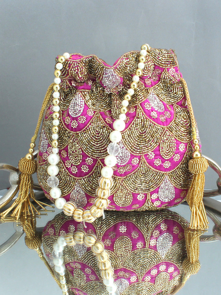 This velvet potli/pouch bag adorned with sequin and shiny glass pipe beads. The potli comes with string to tighten it and tassels in the end. This collectible statement accessory fits in your valuables like a smartphone, makeup, keys, currency and cards.