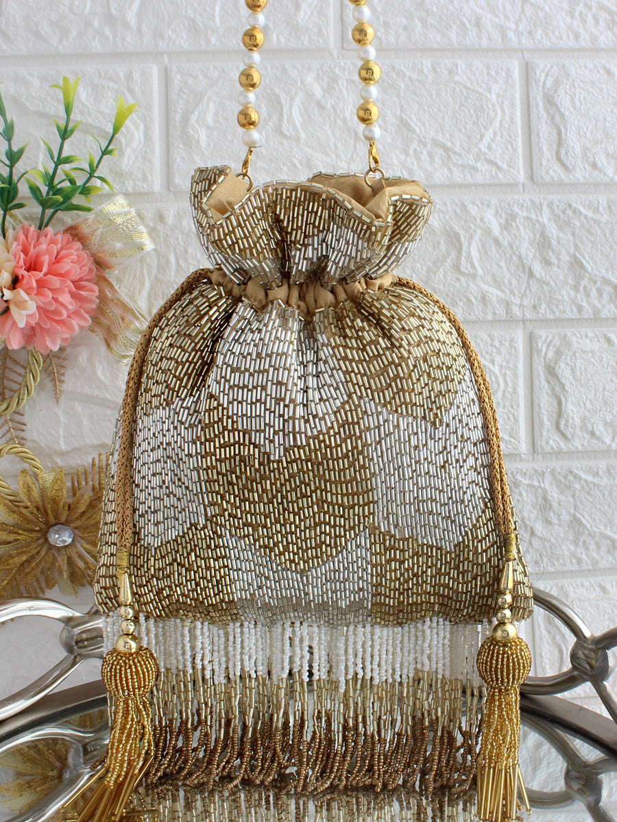 Presenting our Gold Potli/Pouch Bag, adorned with crystal beads for a touch of elegance and sophistication. This exquisite potli is designed with meticulous attention to detail, featuring a string to tighten it and tassels at the end, providing a charming and stylish look. It is spacious enough to fit in your valuables such as a smartphone, makeup, keys, currency, and cards.