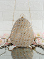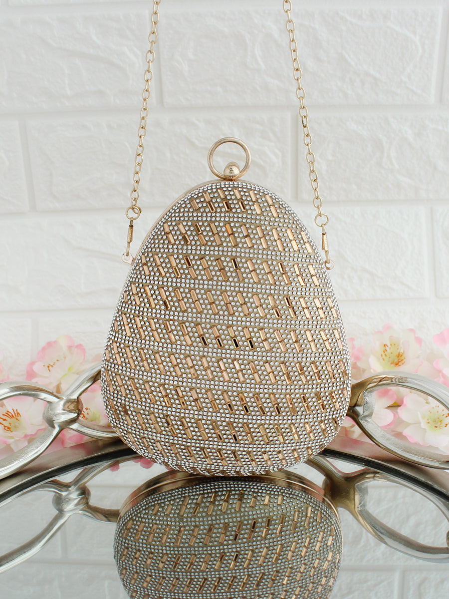 This clutch bag is not only a fashionable accessory but also a functional and versatile piece that can complement various outfits for different occasions. The combination of the pear drop shape, embellishments, and metallic details adds an elegant touch to the overall design.