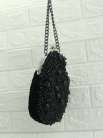 This Clutch Bag, also known as a Batua Soft Pouch, is a stunning accessory that blends traditional charm with contemporary flair. The bag is adorned with black beads,creating a sophisticated, delicate look. It features a durable metal frame with a metallic clasp lock for added security and a refined touch. It features an antique silver chain, it is perfect for fitting essential items such as a smartphone, makeup, keys, currency, and cards.This bag is both functional and a beautiful accessory for any occasion. The combination of the plush velvet and sparkling beads ensures this bag will stand out, making it an ideal choice for evening events or festive celebrations.