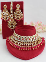 Gold tone bib necklace Set studded with simulated Kundans, faux pearls, multicolor stones and beads.