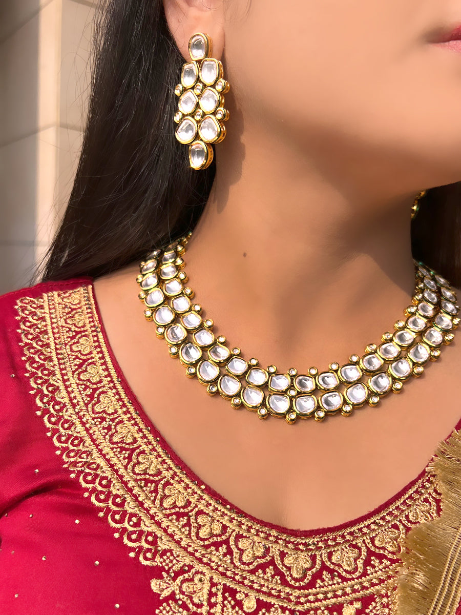 Gold plated bib necklace set studded with simulated Polki diamonds.