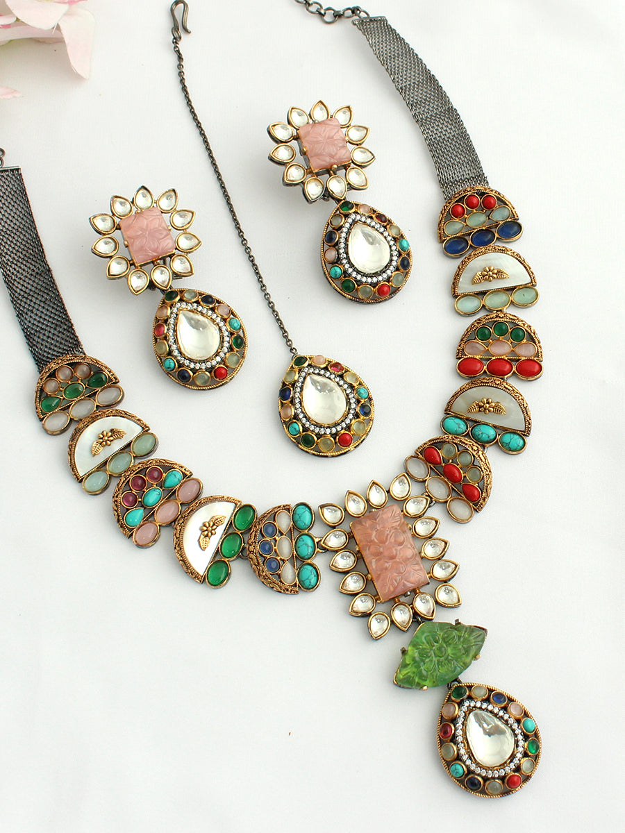 Antique two-tone bib /short necklace set studded with simulated uncut polki diamonds, CZS, mother of pearls, multi stones and carved stones.