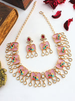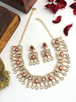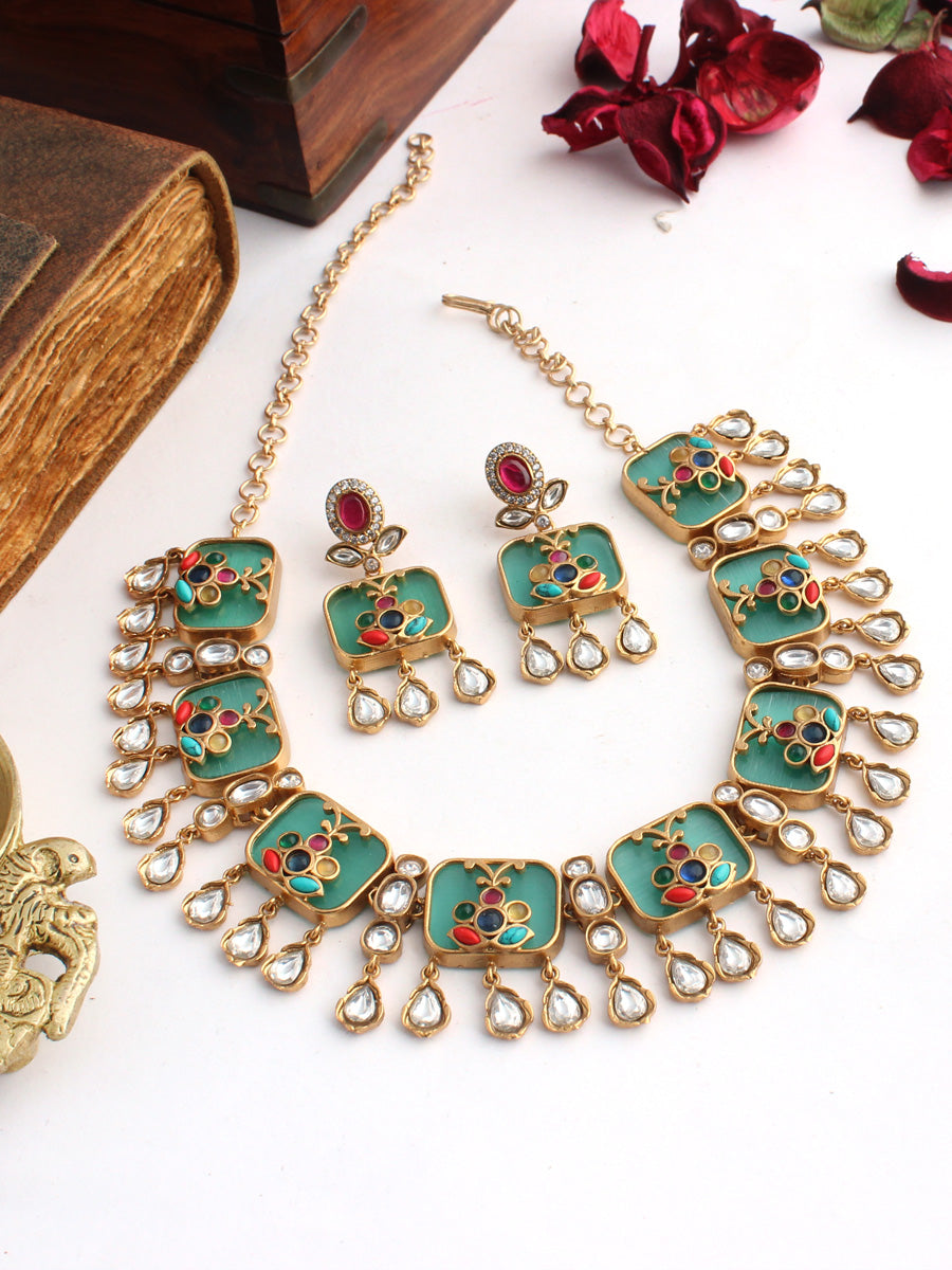 The Gold Plated Necklace Set Studded with Simulated Polki Diamonds, CZs, and Multi-Color Stones is a dazzling ensemble. Here are the details: